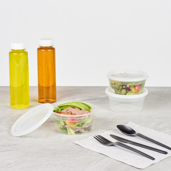 Seamlessly package soups or side dishes with our Asporto 12-ounce Round Clear Plastic Soup Containers. Made from BPA-free, heat-resistant plastic, these transparent soup containers are perfect for piping hot take out orders. These round food containers include a clear plastic lid that guarantees a secure seal, reducing the risk of spills during delivery. Further enhancing their convenience, these deli containers are microwave-safe, so your customers can heat their meals without the need to transfer them. With a 12-ounce capacity, these clear containers for take out offer ample space for your servings. These carry out containers not only offer the convenience of disposability but are also recyclable, providing your patrons with an eco-friendly option for disposal. The transparent construction of these take out boxes allows a clear view of the contents without unsealing. Each disposable to go boxes measures 4.5 inches in diameter by 2.5 inches in height and a capacity of 12 ounces. Sold in a 25 count box. NOTE: Lids are not for microwave use.