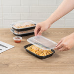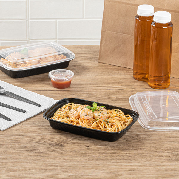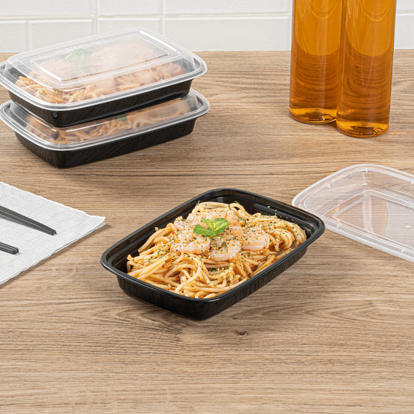 Efficiently manage your meal prep with versatile storage solutions. The Asporto Black Plastic Food Container with a Clear Lid provides an unobstructed view of your packed meals, ensuring easy identification and presentation. This plastic food container is BPA-free and features a microwave-safe design, allowing you to conveniently reheat your meals without transferring them to another dish. Its sturdy construction supports various hot and cold food options, making it ideal for both meal prep and foodservice operations. Measuring 7.7 inches in length, 5.5 inches in width, and 1.5 inches in height, this container offers a 16-ounce capacity, perfectly sized for portion control and efficient storage. Additionally, its recyclable material promotes sustainability, catering to environmentally-conscious establishments. Each order includes 100 Asporto Black Plastic Food Containers with Clear Lids.
