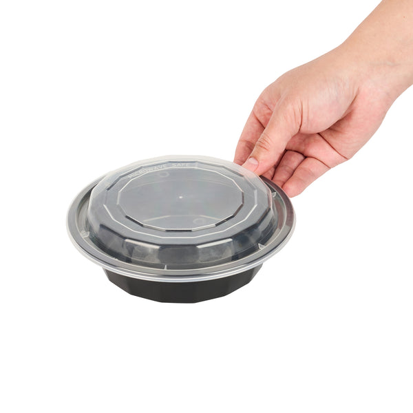 Make it simple to serve food to go with our Asporto 16-ounce Round Black Plastic To Go Boxes. Created from polypropylene plastic, these food take out containers are BPA-free and heat-resistant, making them perfect for serving a wide range of food items. These round food containers come with a clear plastic lid that forms a tight-fitting seal to take you food on the go. The durable plastic construction of these plastic to go boxes ensures they can withstand the weight of hefty portions of food. Holding up to 16 ounces, these black take out boxes are perfect for serving noodles, salads, or pastas. Microwave-safe, these black food containers allow customers to reheat their meals easily. These disposable food boxes are recyclable to facilitate an environmentally friendly cleaning experience. The chic black finish of these microwavable food containers beautifully accentuates the look of your meal. Each disposable carry out containers measures 6.25 inches in diameter by 1.75 inches in height and have a capacity of 16 ounces. Sold in a 100 count box.