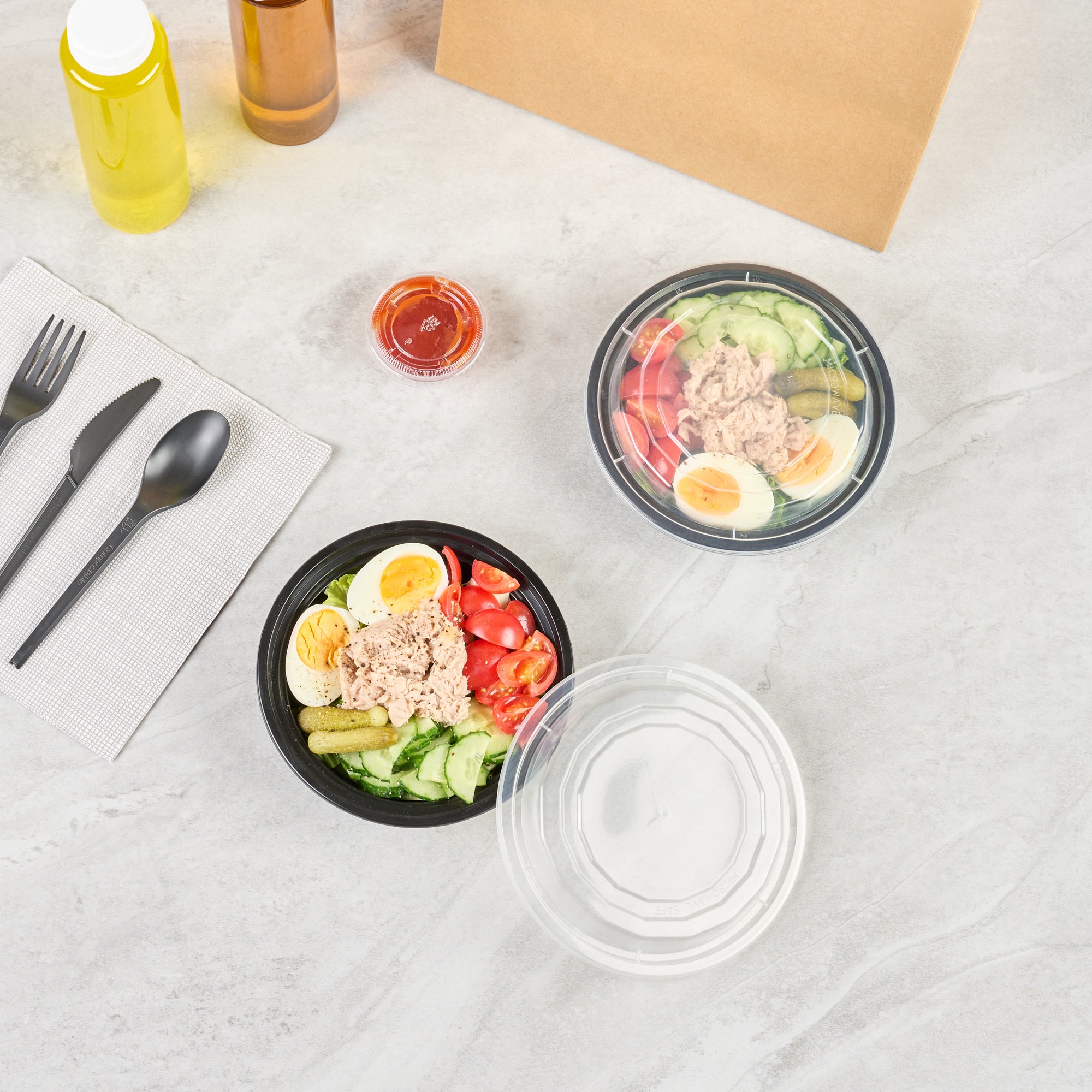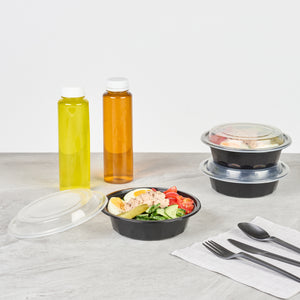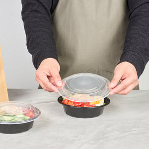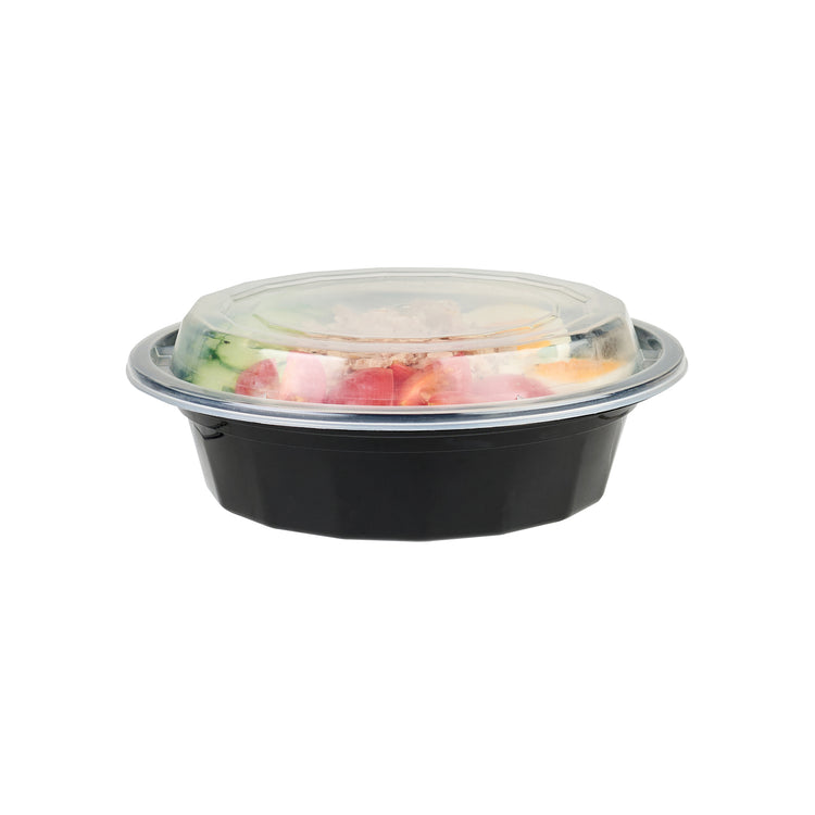 Make it simple to serve food to go with our Asporto 16-ounce Round Black Plastic To Go Boxes. Created from polypropylene plastic, these food take out containers are BPA-free and heat-resistant, making them perfect for serving a wide range of food items. These round food containers come with a clear plastic lid that forms a tight-fitting seal to take you food on the go. The durable plastic construction of these plastic to go boxes ensures they can withstand the weight of hefty portions of food. Holding up to 16 ounces, these black take out boxes are perfect for serving noodles, salads, or pastas. Microwave-safe, these black food containers allow customers to reheat their meals easily. These disposable food boxes are recyclable to facilitate an environmentally friendly cleaning experience. The chic black finish of these microwavable food containers beautifully accentuates the look of your meal. Each disposable carry out containers measures 6.25 inches in diameter by 1.75 inches in height and have a capacity of 16 ounces. Sold in a 50 count box. NOTE: Lids are not for microwave use.