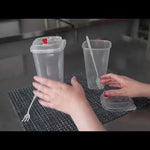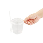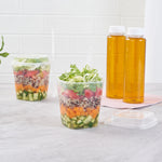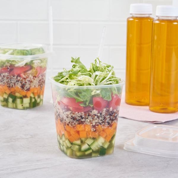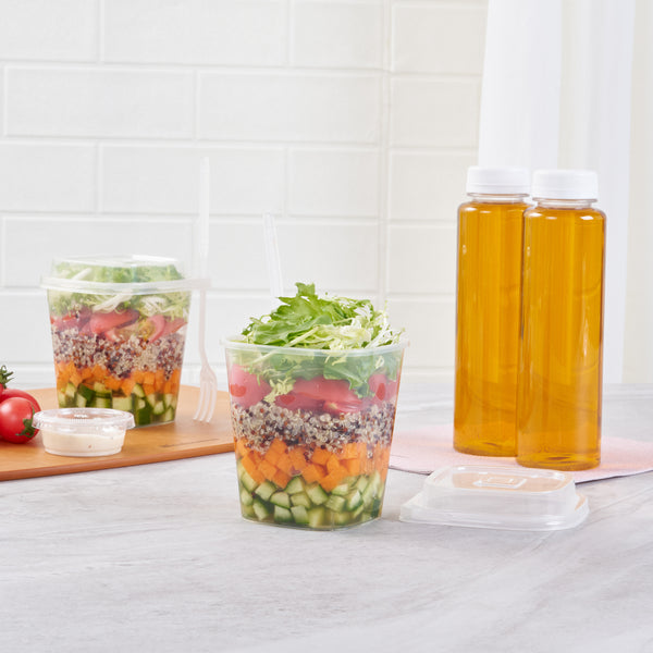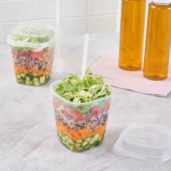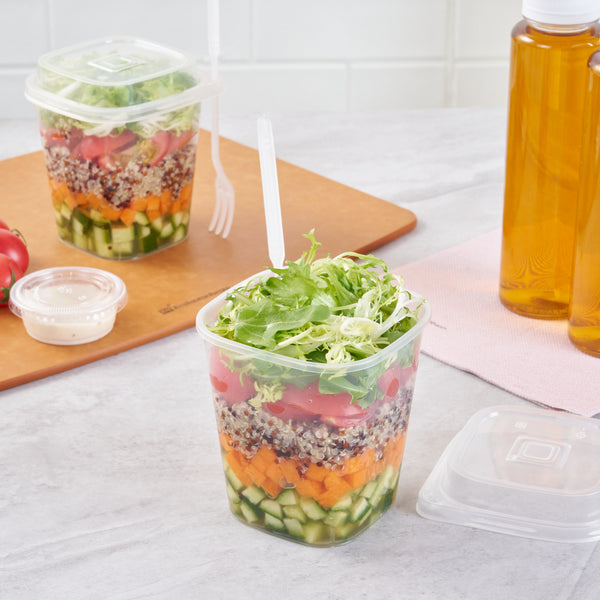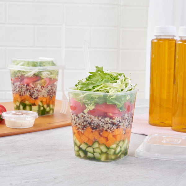 Upgrade your deli containers with our Asporto 17-Ounce Clear Plastic Salad To Go Cups. Ideal for serving on-the-go customers, these snack cups are portable and expertly contain all types of fare. They also act as salad shakers, making them perfect for mixing your fruits, salads, and granolas. Featuring a clear lid and cup, these salad shaker containers give your foods that freshly made and appetizing look. The lid of these salad shakers forms a tight seal to avoid leaking near the rim. With a fork included, these food containers with lids allow customers to easily enjoy your delicious snacks. Great for serving beverages, these salad cups are equipped with a hole for sipping your refreshing drinks. The built-in straw slot of these salad shaker sets gives customers the option to drink your delicious shakes or smoothies through a straw. Crafted from recyclable plastic, these to go drink cups reduce the cleanup time at your catered event, food stand, food truck, or deli. These 17-ounce plastic containers with lids measure 3.62 inches in length by 3.62 inches in width by 3.89 inches in height. Sold in a 100 count box.