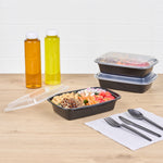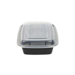 Easily package to go orders or wrap up customers' leftovers in our Asporto 24-ounce Rectangle Black Plastic To Go Boxes. Made from microwavable and BPA-free polypropylene, these plastic food containers with lids make it easy for customers to reheat and enjoy your dishes. Their sturdy plastic construction can support up to 24 ounces of your tasty fare and is designed to expertly hold its shape in the microwave. Each of these conveniently disposable and recyclable plastic to go containers measures 8 inches in length by 5.25 inches in width by 1.75 inches in height. Featuring a classic black finish with a clear plastic lid, these microwavable containers add a sophisticated touch to any take out or delivery orders. Each 24-ounce box contains 50 black plastic take out containers and 50 clear plastic lids.