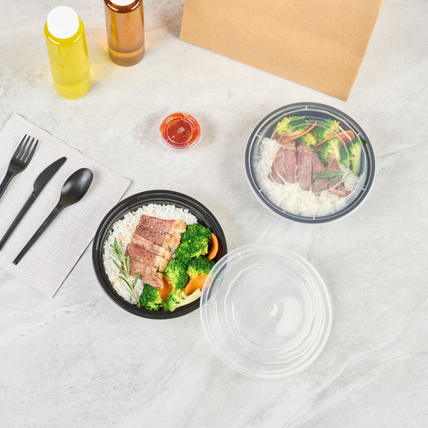 Efficiently transport your customer's hot food using our Asporto 24-ounce Round Black Plastic To Go Boxes. Made with BPA-free polypropylene plastic, these food take out containers are also heat resistant, making them perfect for all types of dishes. Each round food container includes a secure clear plastic lid that seals to prevent spills in transit. These black take out boxes are microwave-safe, giving customers the convenience of reheating meals without changing utensils. Capable of holding 24 ounces, these disposable carry out containers are ideal for sumptuous meal portions. For eco-minded establishments, these plastic to go boxes are recyclable and disposable for quick cleanup. The black finish of these takeaway containers gives a touch of sophistication to your takeaway meals. Each take out container measures 7.25 inches in diameter by 1.5 inches in height and have a capacity of 24 ounces. Sold in a 50 count box. NOTE: Lids are not for microwave use.