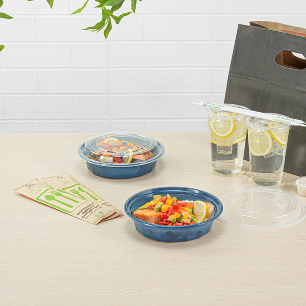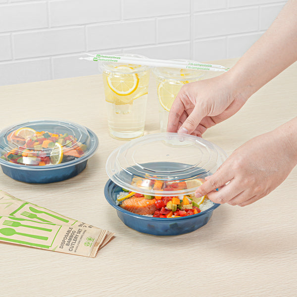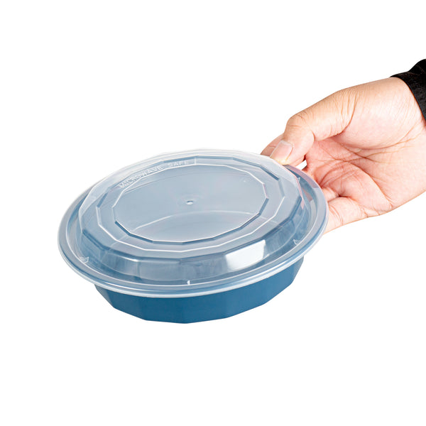 Elevate your take out service with our Asporto 24-ounce Round Midnight Blue Plastic To Go Boxes. These take out containers have a clear plastic lid that forms a tight-fitting seal, making them ideal for taking food on the go. Designed to be microwave-safe, these to go boxes let you reheat meals without the need to transfer them to a different dish. Crafted from BPA-free plastic, these takeaway boxes boast durability and are ideal for packing hot and cold food items. These meal prep containers have a midnight blue finish providing an elegant presentation for take out orders. To facilitate an easy post-meal cleanup, these carry out containers are disposable and can be discarded after use. These take out boxes are recyclable and showcase your commitment to environmental responsibility. Measuring 7.25 inches in length by 1.5 inches in height, these disposable take out containers can hold up to 24 ounces, ideal for packing various culinary creations. Sold in a 100 count box.