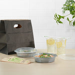 Enhance your foodservice with our Asporto 24-ounce Round Silver Plastic To Go Boxes. Featuring a clear plastic lid, these to go boxes form a tight-fitting, secure seal to prevent potential leaks in transit. These takeaway boxes are microwave-safe and allow for convenient meal reheating without the need for additional utensils. Crafted from BPA-free plastic, these take out containers are durable and ideal for packing various hot and cold food items. These meal prep containers have a silver finish that adds an elegant touch to your meal presentation. Ideal for a swift post-meal cleaning experience, these carry out containers are disposable and can be discarded after use. These to go containers are recyclable and showcase your environmental commitment to your patrons. Measuring 7.25 inches in diameter by 1.5 inches in height, these food containers have a capacity of 24 ounces. Sold in a 100 count box.