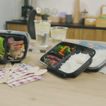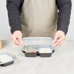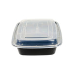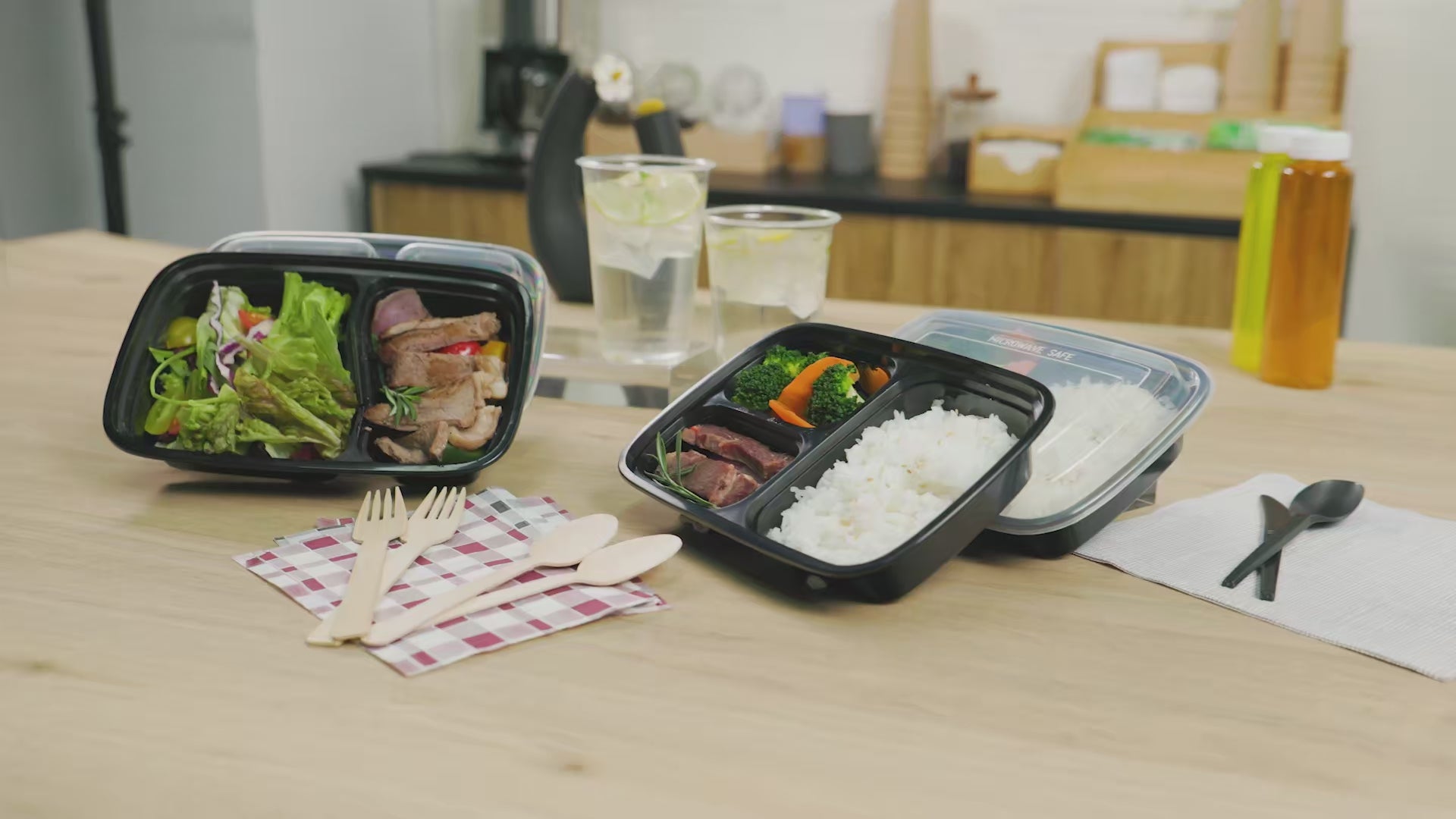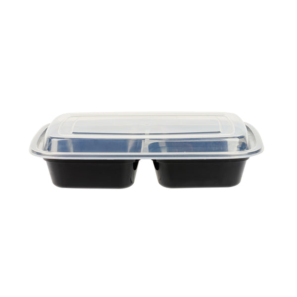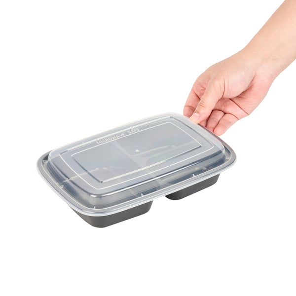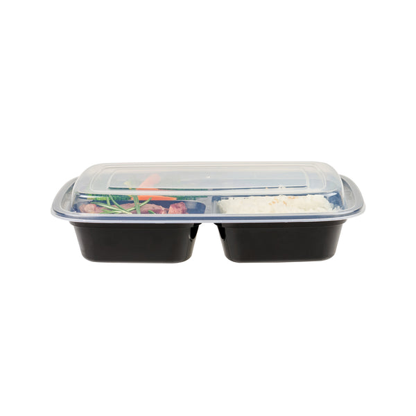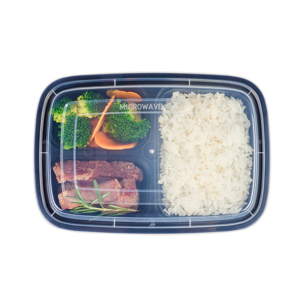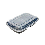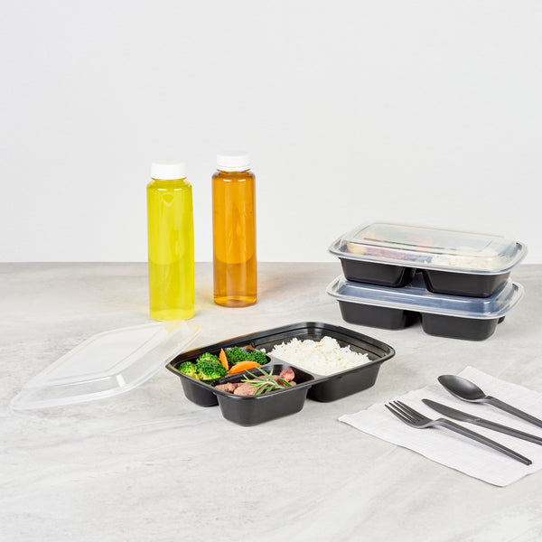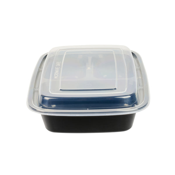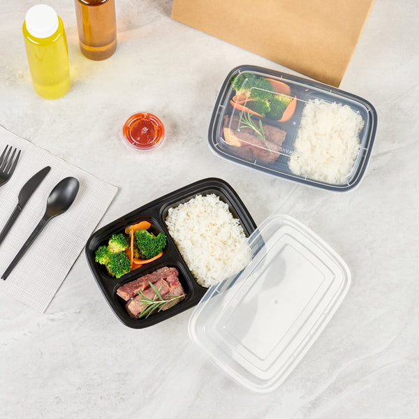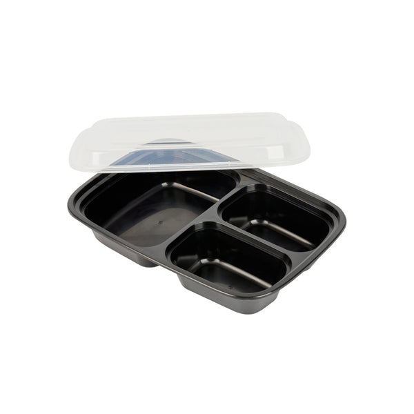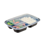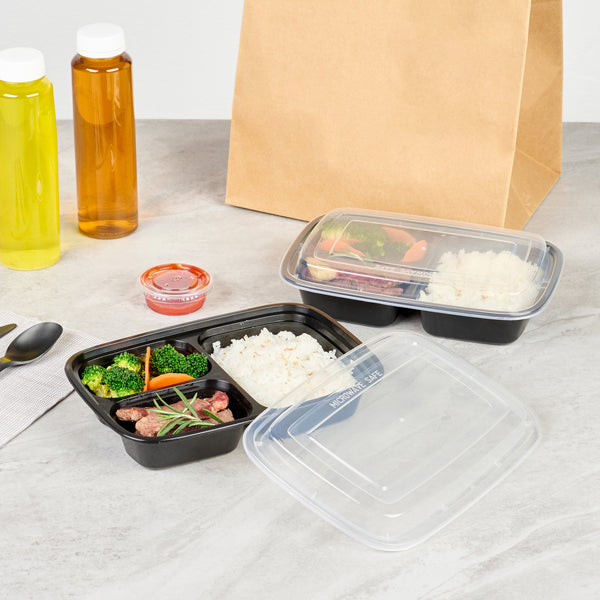 Conveniently serve or store savory dishes with our Asporto 26-Ounce Black Plastic 3 Compartment Food Containers. Constructed from PP plastic, these 3 compartment food containers are BPA-free and heat-resistant to pack various hot or cold menu items. Each disposable takeaway boxes have 3 compartments that have a capacity of 4,4, and 10 ounces. These takeaway containers come with a clear plastic lid to provide a secure seal to minimize potential spills and leaks during transportation. Microwave-safe, these black to go boxes allow customers to reheat their meals easily without the need for switching containers. These meal prep containers are recyclable and disposable to ensure a swift cleanup while showcasing your establishment’s eco-conscious practices. Measuring 8.75 inches in length by 6 inches in width by 1.75 inches in height, these black lunch boxes with compartments have a total capacity of 26 ounces. Sold in a 50 count box. NOTE: Lids are not for microwave use.