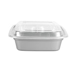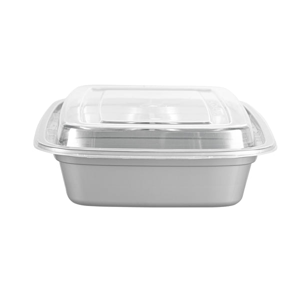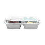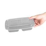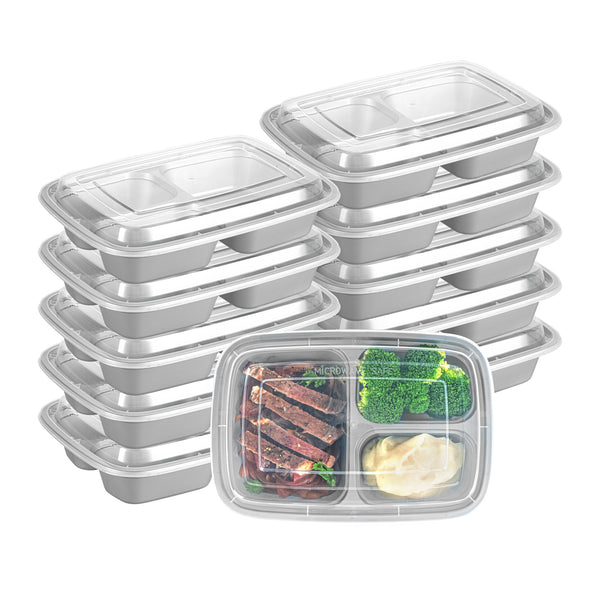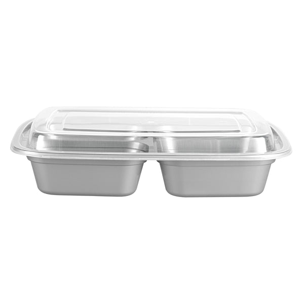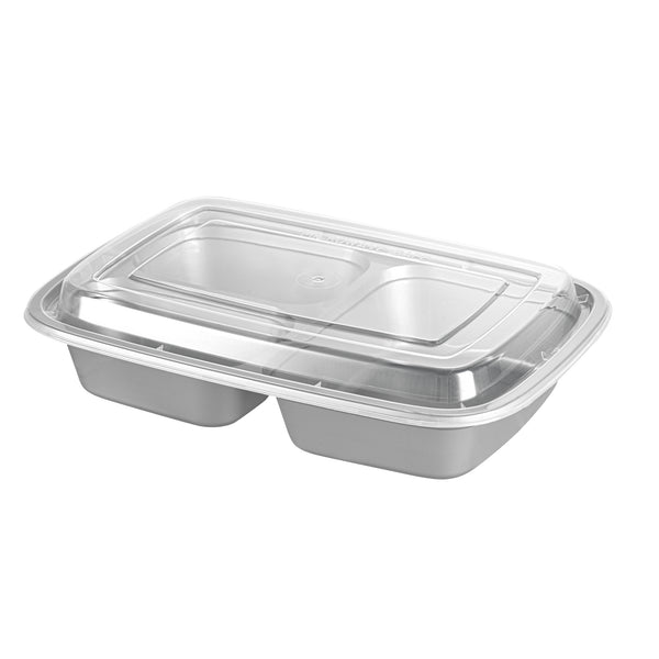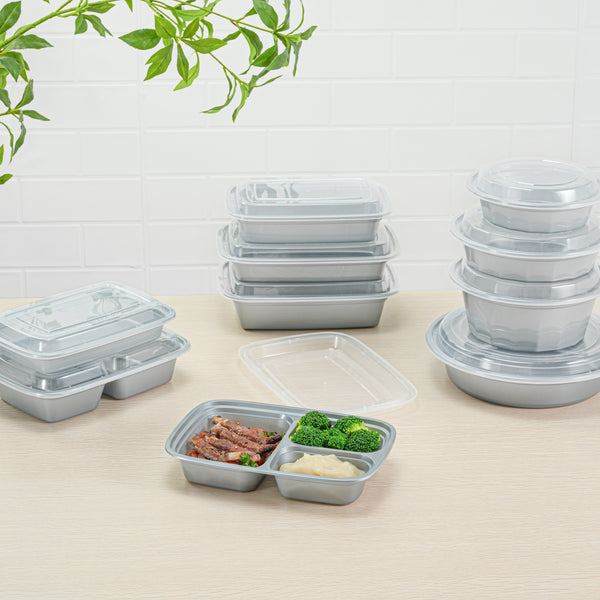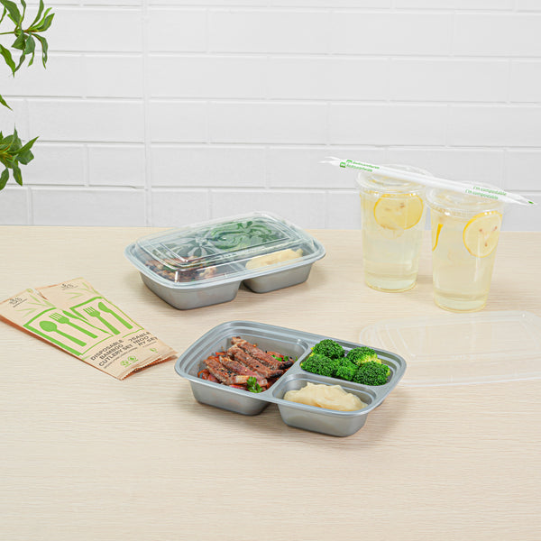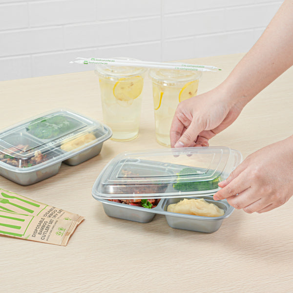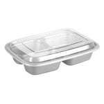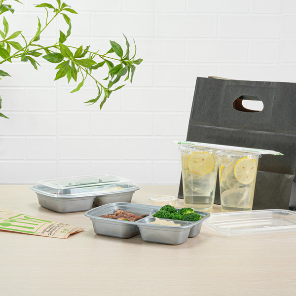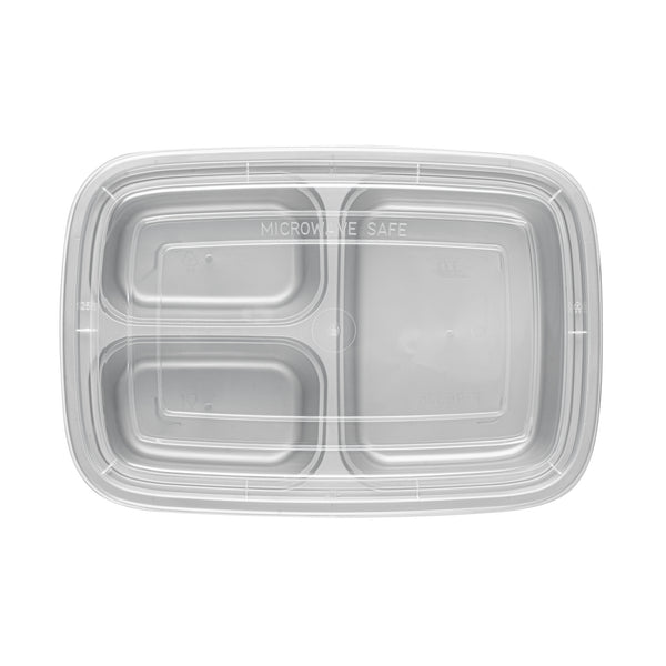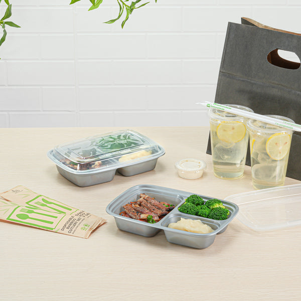 Enhance your foodservice with our Asporto 26-ounce Silver Plastic 3 Compartment Food Containers. Featuring three separate compartments, these to go boxes offer a capacity of 4, 4, and 10 ounces, ideal for organizing different meal components. Equipped with a clear plastic lid, these takeaway boxes provide a secure seal to minimize potential spills and leaks during transportation. These carry out containers are microwave-safe and allow customers to reheat their meals easily without the need for switching containers. Made from durable BPA-free plastic, these take out containers are suitable for packing various hot or cold menu items. The stylish silver finish of these meal prep containers accentuates the visual appeal of your food presentation. These to go containers are disposable and can be discarded after use, ideal for easy post-meal cleanup. To help minimize your carbon footprint, these disposable take out containers are recyclable. Measuring 8.75 inches in length by 6 inches in width by 1.75 inches in height, these takeaway containers have a total capacity of 26 ounces. Sold in a 100 count box.
