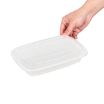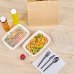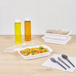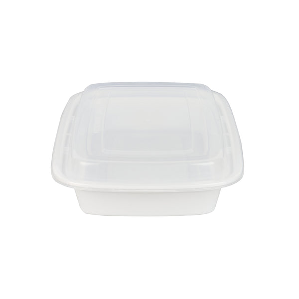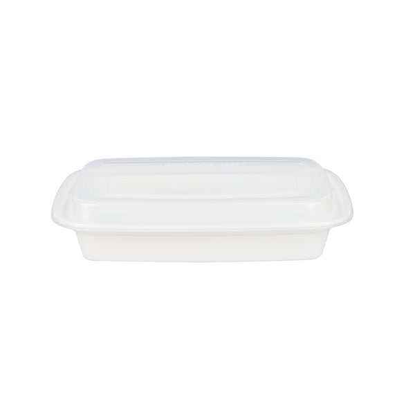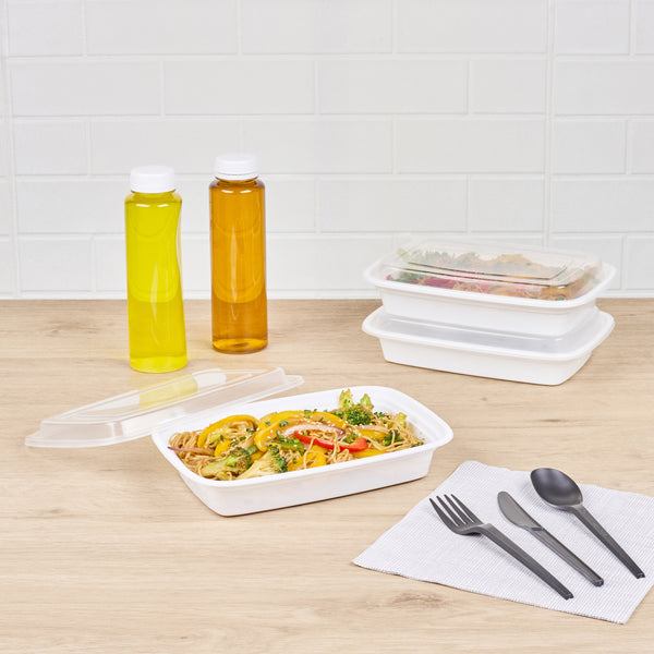 Give guests a sneak peek inside your perfectly prepared dishes with our Asporto 28-ounce Rectangle White Plastic To Go Boxes. Constructed from heat-resistant and BPA-free polypropylene plastic, these disposable meal prep containers are grease-resistant, moisture-resistant, and microwave-safe. Their durable plastic construction is built to expertly hold its shape in the microwave, while its strong and sturdy base supports hefty portions of your dishes. Each of these microwavable food containers has an included clear plastic lid that snaps on to form a leak-resistant and mess-free seal. Conveniently disposable and recyclable, these plastic to go containers with lids are a great food packaging solution for cafes, food trucks, and restaurants. Each of these white plastic to go containers measures 8.75 inches in length by 6 inches in width by 1.5 inches in height, and can contain up to 28 ounces. Sold in a 100 count box.