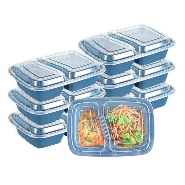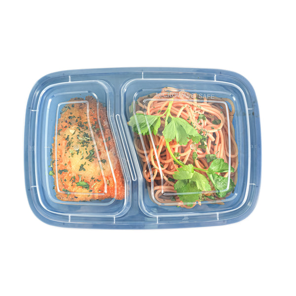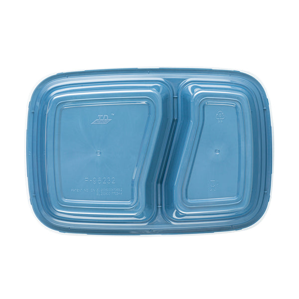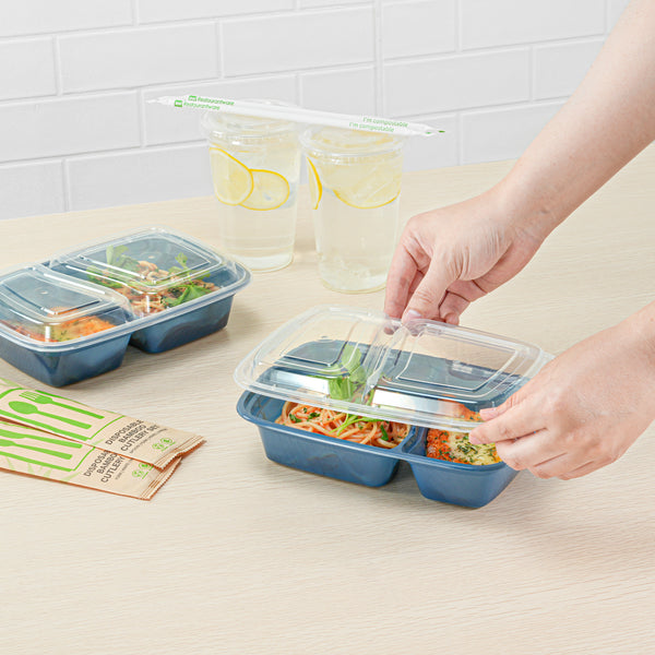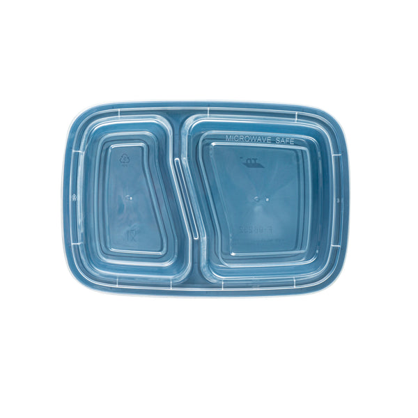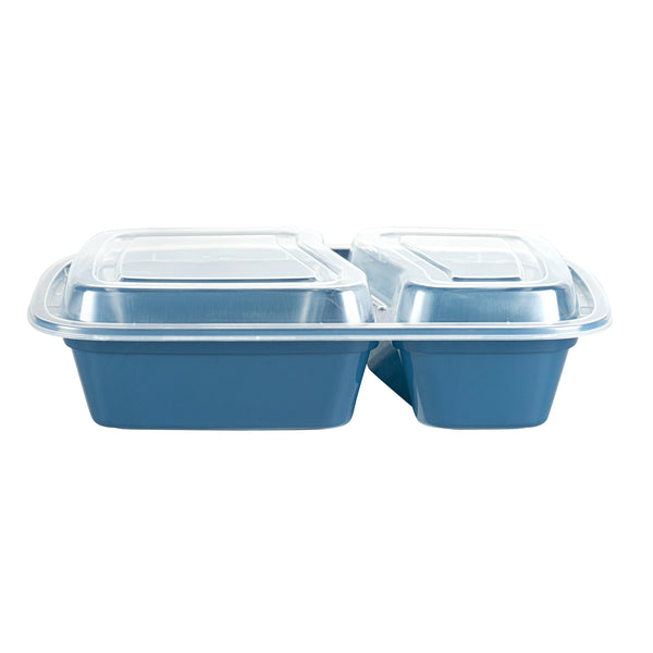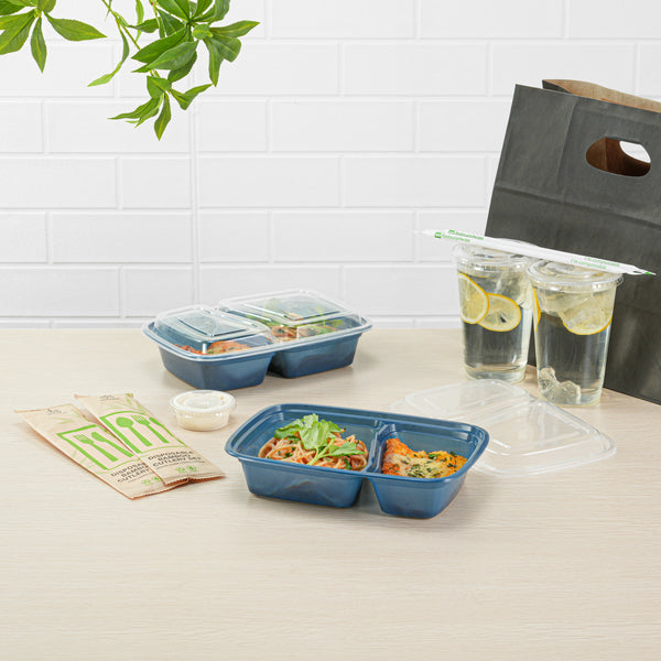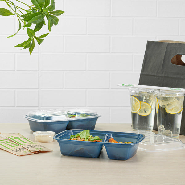 Enhance your foodservice offerings with our Asporto 32-ounce Midnight Blue Plastic 2 Compartment Food Containers. These meal prep containers feature 2 compartments with 12.5 and 8 ounce capacities, efficiently separating entrees from snacks or sides. To minimize the risk of spills in transit, the clear plastic lids of these takeaway boxes create a tight-fitting seal to keep your food intact. These to go boxes are microwave-safe and allow customers to heat meals conveniently. Manufactured from BPA-free plastic, these take out containers are durable and ideal for packing various hot and cold food items. The midnight blue finish of these carry out containers enhances the look of take out and delivery food orders. These to go containers are disposable and can discarded after use for an easy cleaning experience. To showcase your eco-friendly practices to your patrons, these takeaway containers are recyclable. Measuring 8.75 inches in length by 6 inches in width by 2 inches in height, these plastic food containers have a total capacity of 32 ounces. Sold in a 100 count box.
