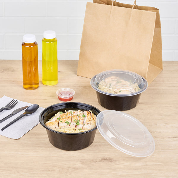 Pack your customers' takeaway food with our Asporto 32-ounce Round Black Plastic To Go Boxes. These round food containers are constructed from heat-resistant, BPA-free polypropylene plastic, and can accommodate a diverse range of food. Each food take out containers come with a perfect fitting clear plastic lid that adverts any possible spills en route. With a microwave-safe nature, these plastic to go boxes render reheating meals easy and mess-free. These black take out boxes can hold up to 32 ounces, making them a wonderful option for hearty meals. Recyclable and disposable, these takeaway containers reflects your eco-consciousness practices while facilitating hassle-free cleaning procedures. The elegant black finish of these disposable carry out containers adds a touch of refinement to your carry out orders. Each takeaway box for food measures 7.25 inches in diameter by 3 inches in height and have a capacity of 32 ounces. Sold in a 50 count box. NOTE: Lids are not for microwave use.