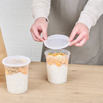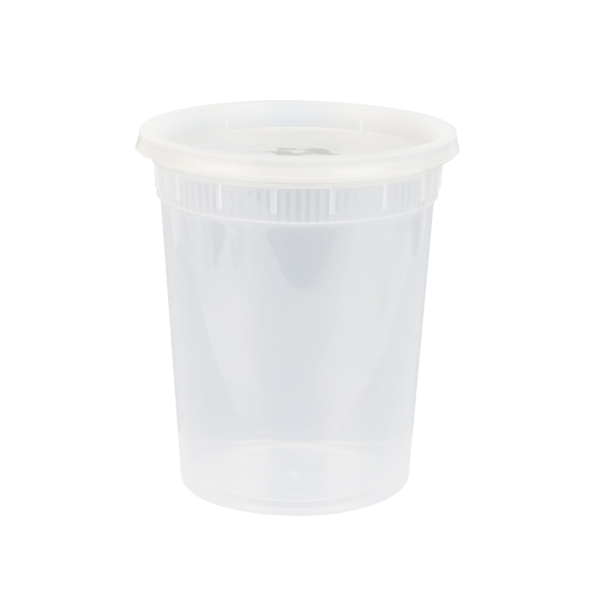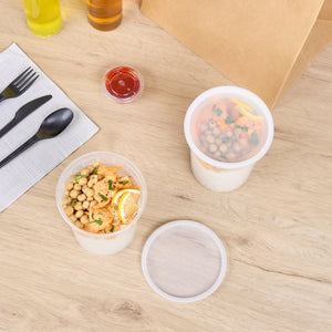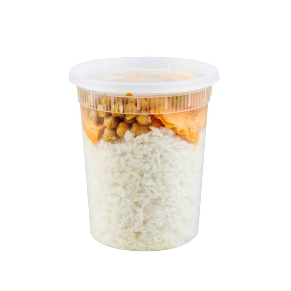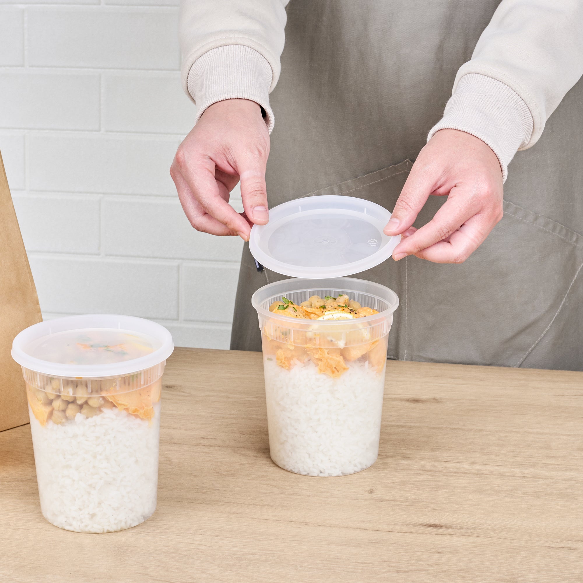 Seamlessly pack sizable portions of soups or snacks for take out services with our Asporto 32-ounce Round Clear Plastic Soup Containers. These clear containers for take outs are crafted from BPA-free and heat-resistant plastic, making them great for delivering hot meals. Each disposable to go boxes features a clear plastic lid that forms a secure seal to prevent spills during transit. These transparent soup containers are microwave-safe, eliminating the need to transfer food when reheating. With an impressive 32-ounce capacity, these round food containers are great for large servings. These takeaway containers are recyclable, providing customers with an eco-friendlier way to discard them after use. With a clear finish, these disposable food containers allow your patrons to visually assess their contents without the need to unseal them. Each carry out container measures 4.5 inches in diameter by 5.5 inches in height and have a capacity of 32 ounces. Sold in a 100 count box. NOTE: Lids are not for microwave use.
