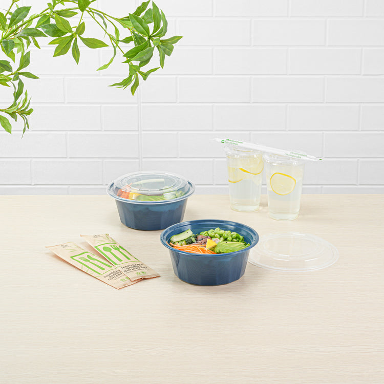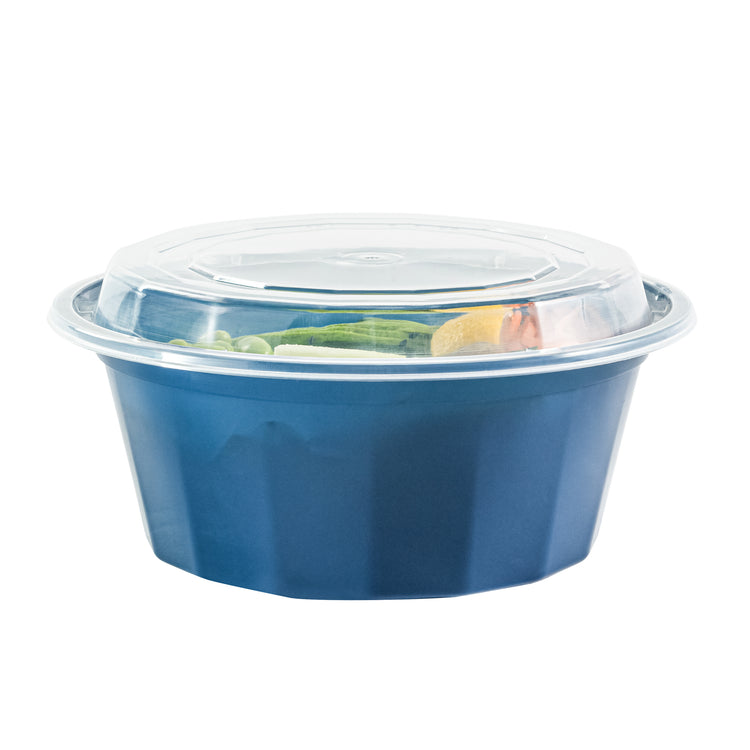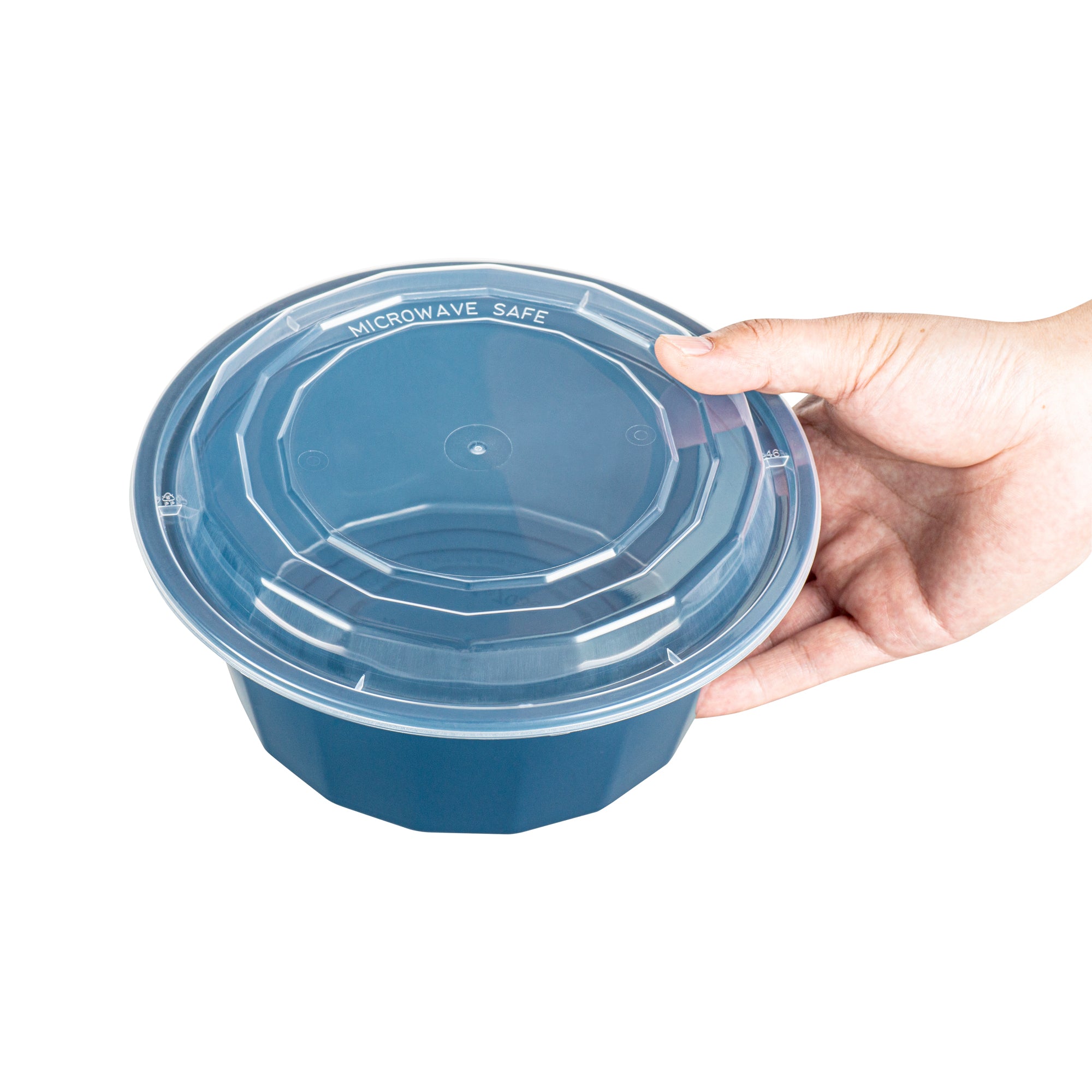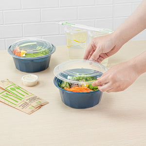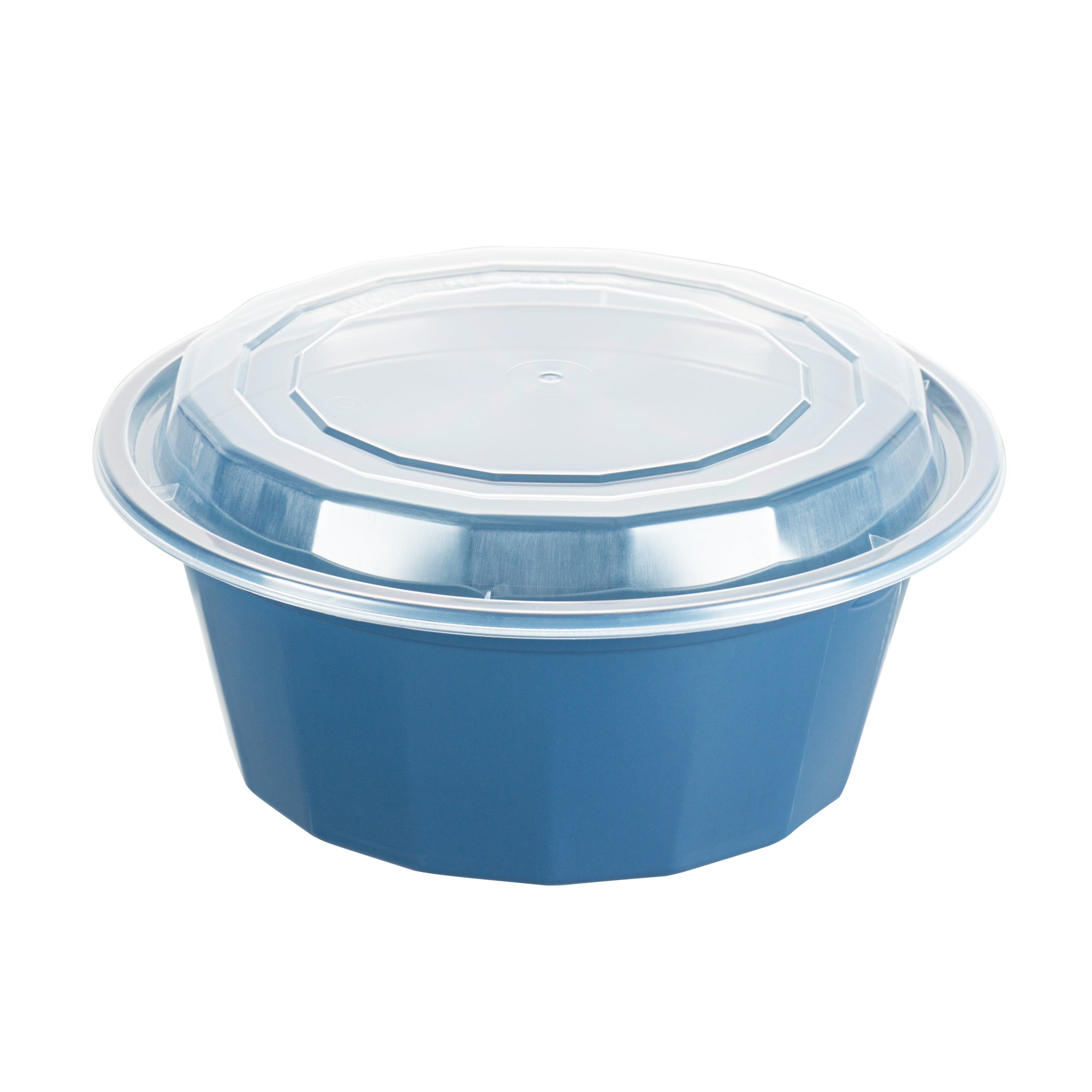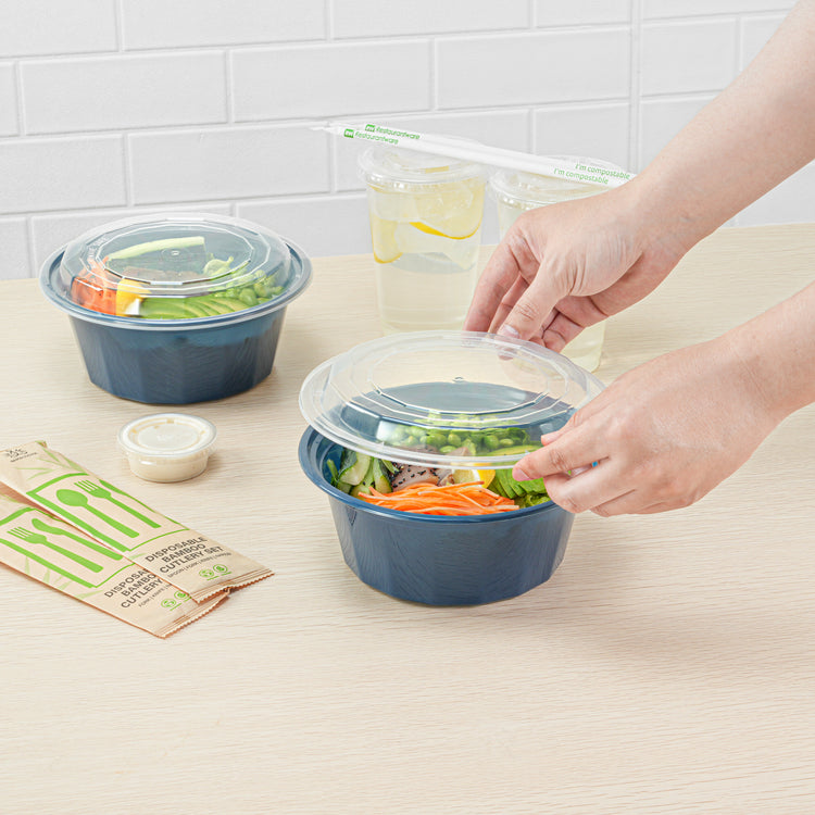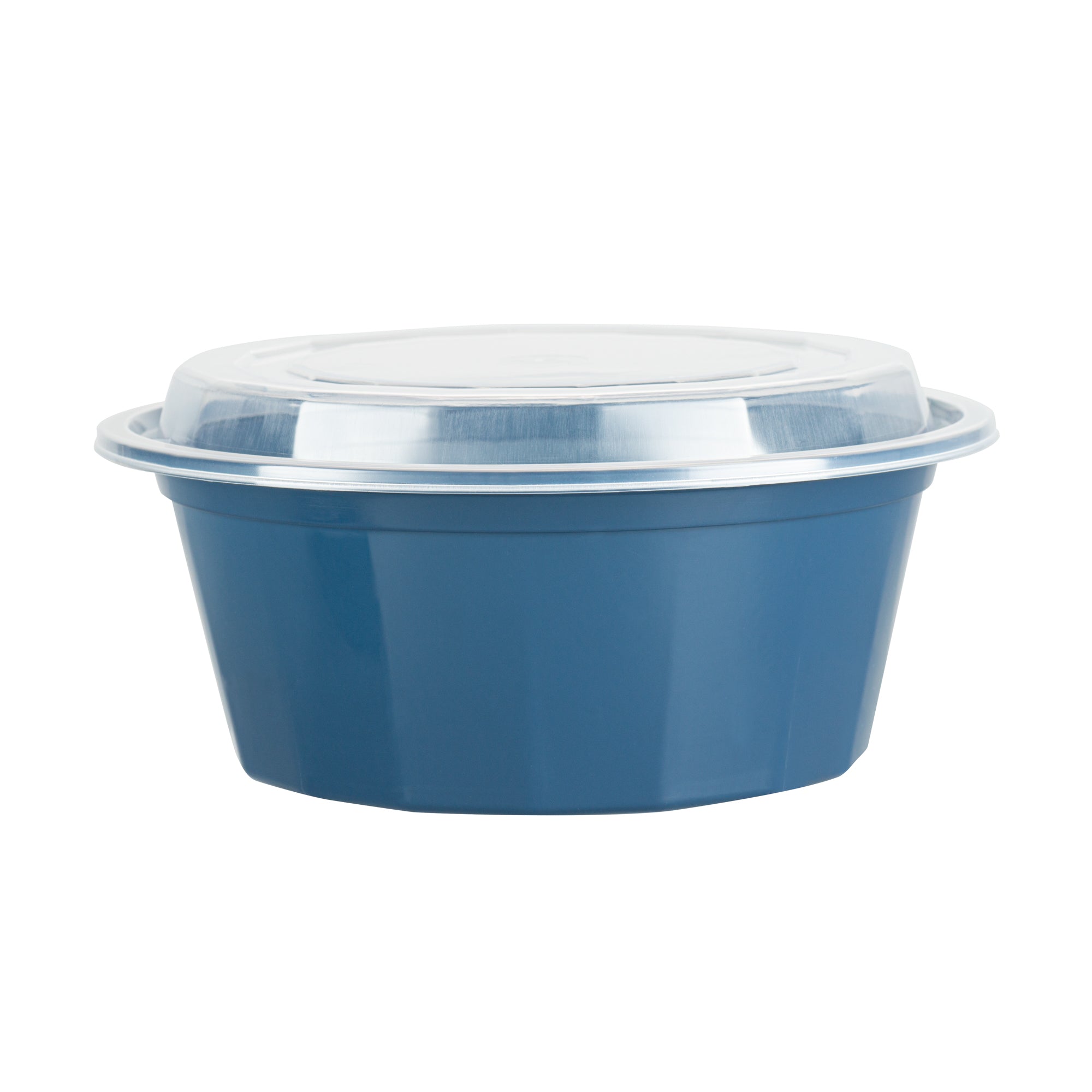 Elevate your foodservice with our Asporto 32-ounce Round Midnight Blue Plastic To Go Boxes. These take out containers come with a perfectly fitting clear plastic lid that prevents any possible spills in transit. Designed to be microwave-safe, these to go boxes make reheating meals easy without the need to transfer them to a different dish. These takeaway boxes are crafted of BPA-free plastic and are durable, ideal for packing various hot and cold food items. With a midnight blue finish, these meal prep containers provide a stylish look for your food presentations. These carry out containers are disposable and can be discarded after use. Ideal for showcasing your eco-conscious practices to your patrons, these take out boxes are conveniently recyclable. Measuring 7.25 inches in diameter by 3 inches in height, these to go containers have a capacity of 32 ounces. Sold in a 100 count box.
