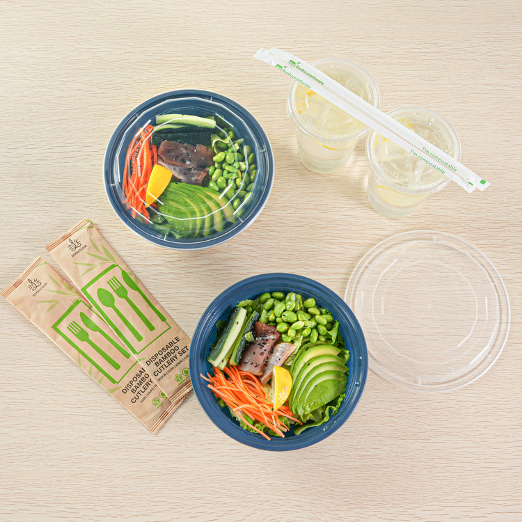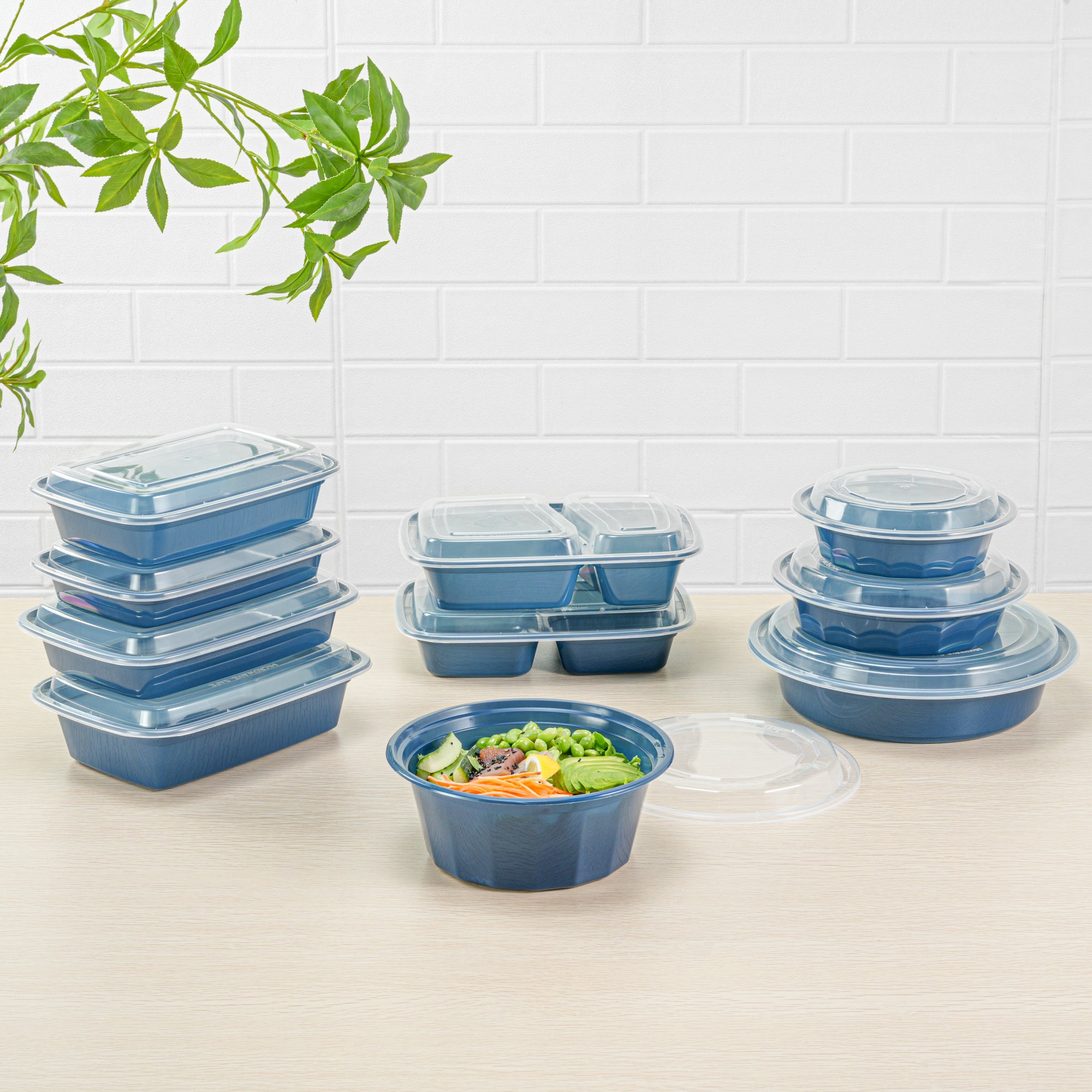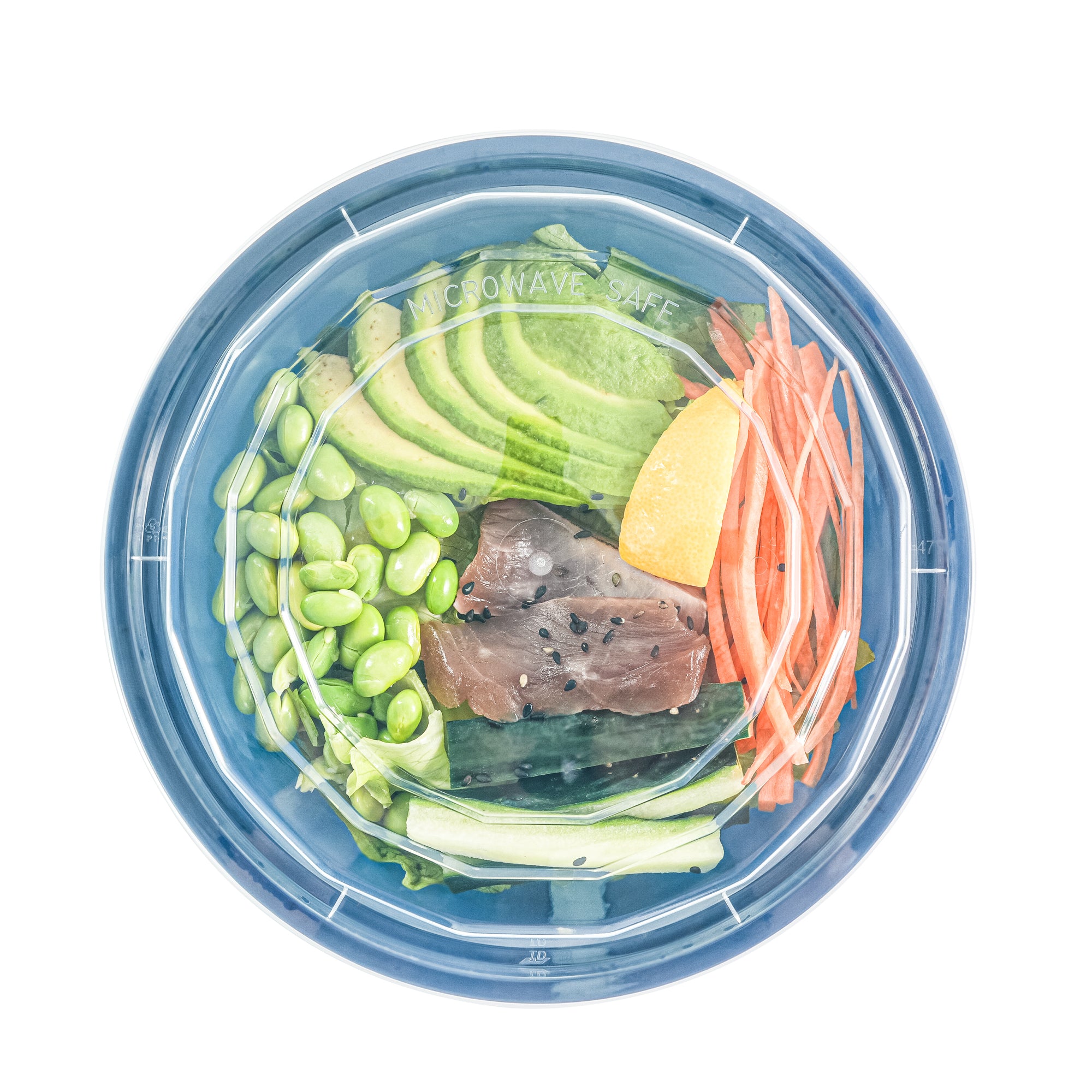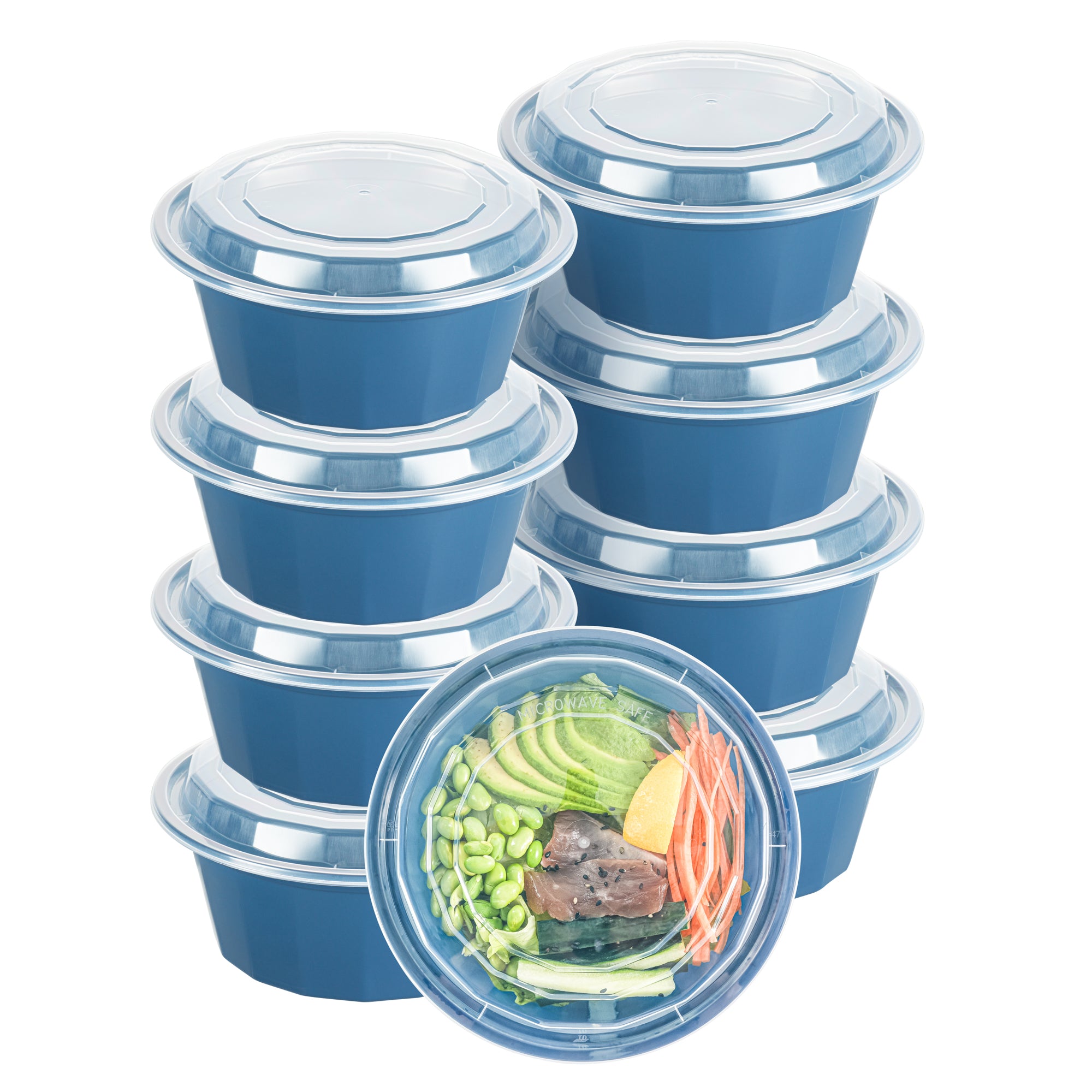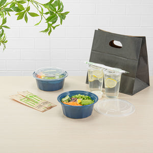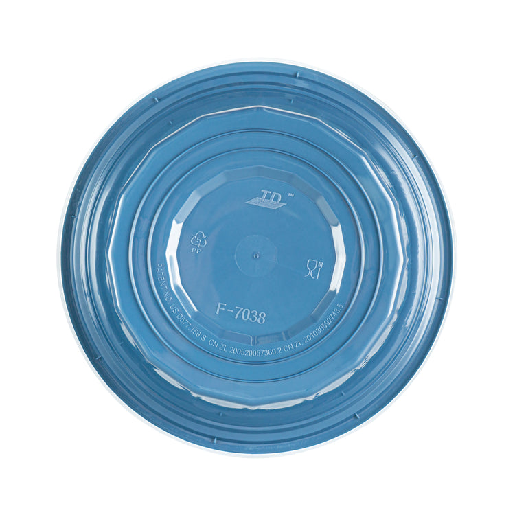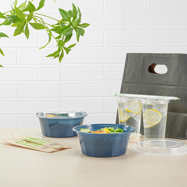 Elevate your foodservice with our Asporto 32-ounce Round Midnight Blue Plastic To Go Boxes. These take out containers come with a perfectly fitting clear plastic lid that prevents any possible spills in transit. Designed to be microwave-safe, these to go boxes make reheating meals easy without the need to transfer them to a different dish. These takeaway boxes are crafted of BPA-free plastic and are durable, ideal for packing various hot and cold food items. With a midnight blue finish, these meal prep containers provide a stylish look for your food presentations. These carry out containers are disposable and can be discarded after use. Ideal for showcasing your eco-conscious practices to your patrons, these take out boxes are conveniently recyclable. Measuring 7.25 inches in diameter by 3 inches in height, these to go containers have a capacity of 32 ounces. Sold in a 100 count box.