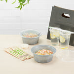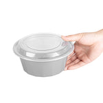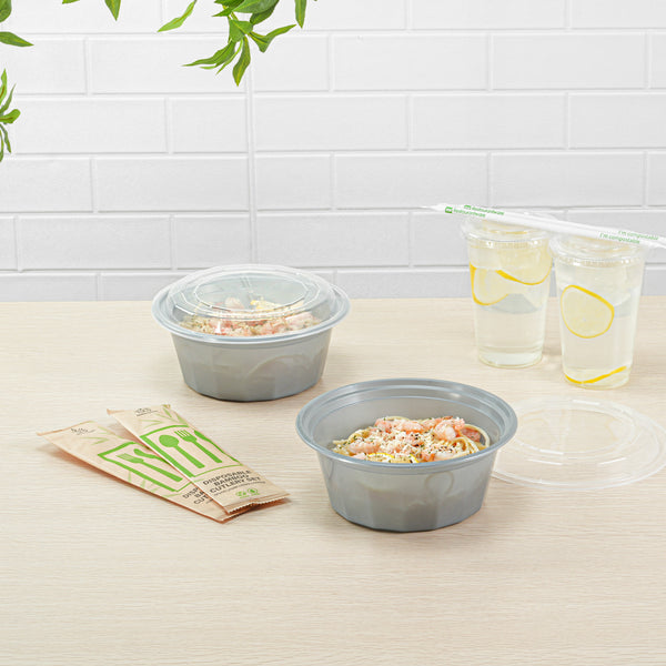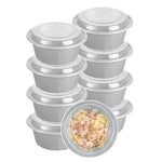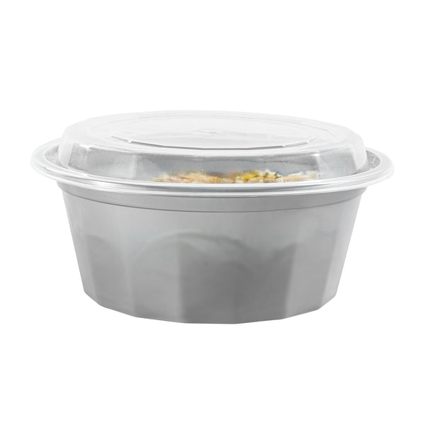 Pack your meals with our Asporto 32-ounce Round Silver Plastic To Go Boxes. These meal prep containers come with a clear plastic lid that prevents any possible spills during transport. The microwave-safe design of these carry out containers lets you reheat meals easily without transferring them to a separate container. These takeaway boxes are made from BPA-free plastic and are durable, ideal for packing hot and cold food items. Featuring a silver finish, these to go boxes add a stylish touch to your food presentation. These take out containers are disposable and can be easily discarded after use for a hassle-free cleanup. Ideal for eco-friendly foodservice establishments, these to go containers are recyclable. Measuring 7.25 inches in diameter by 3 inches in height, these disposable take out boxes have a capacity of 32 ounces and are ideal for packing a variety of dishes. Sold in a 100 count box.