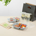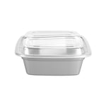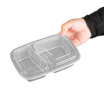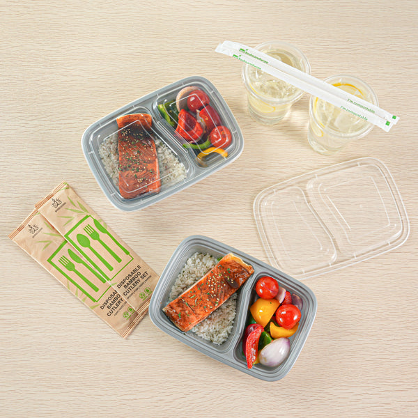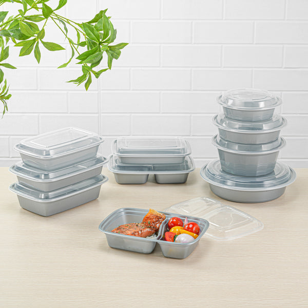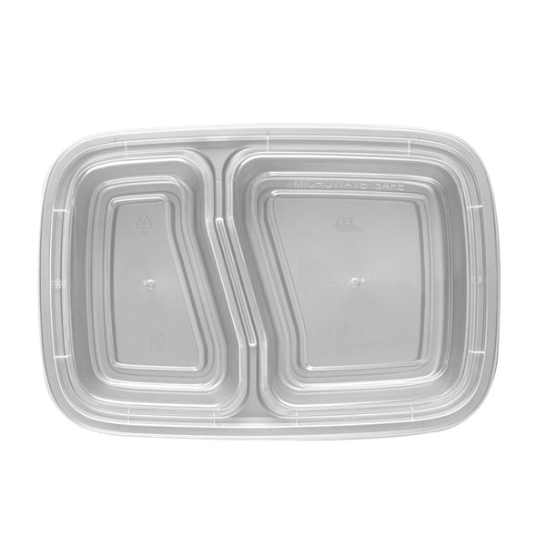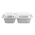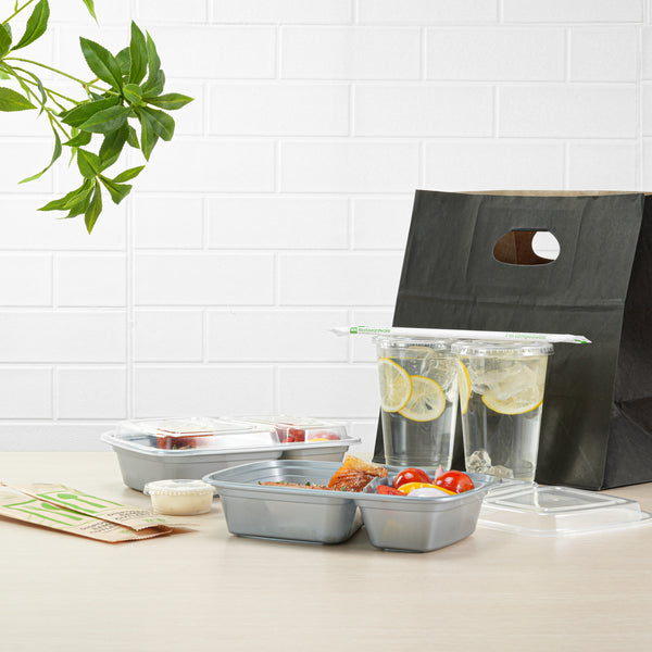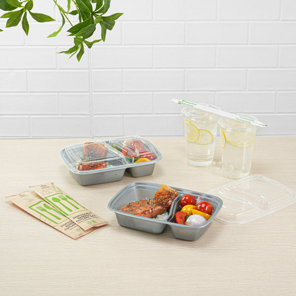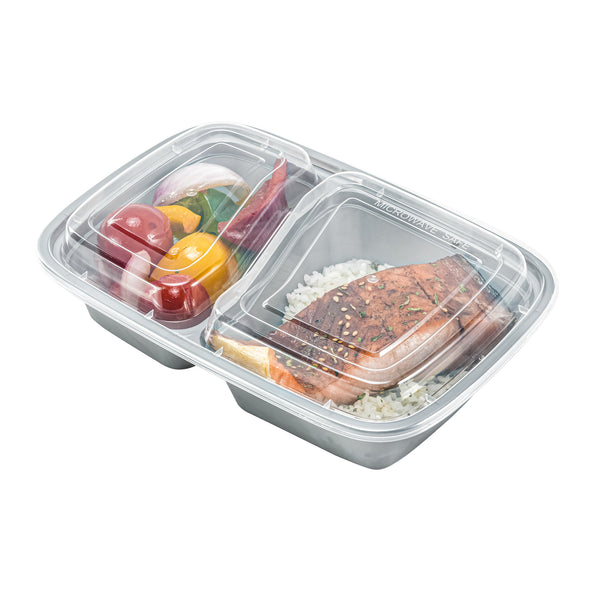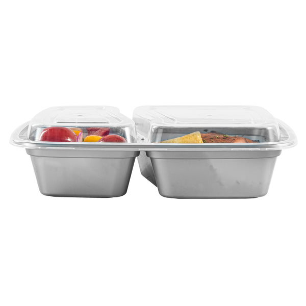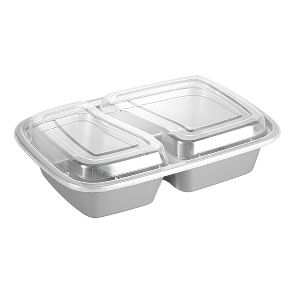 Pack your culinary creations with our Asporto 32-ounce Silver Plastic 2 Compartment Food Containers. These meal prep containers have 2 compartments that have a capacity of 12.5 and 8 ounces and efficiently separate entrees from snacks or sides. The clear plastic lids of these carry out containers snap on tightly, minimizing the risk of spills and avoiding messes. These takeaway boxes are microwave-safe and allow you to reheat meals without transferring them to different containers. Made from BPA-free plastic, these take out containers are durable, making them perfect for packing various hot and cold food items. The sleek silver finish of these to go boxes enhances the presentation of your take out and delivery food orders. These to go containers are disposable and facilitate an easy cleaning experience. Ideal for eco-friendly foodservice establishments, these food containers are recyclable. Measuring 8.75 inches in length by 6 inches in width by 2 inches in height, these disposable take out containers have a total capacity of 32 ounces. Sold in a 100 count box.