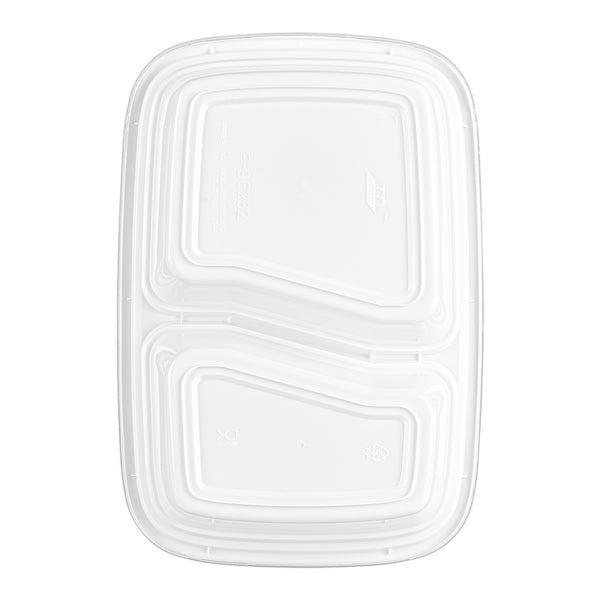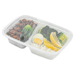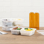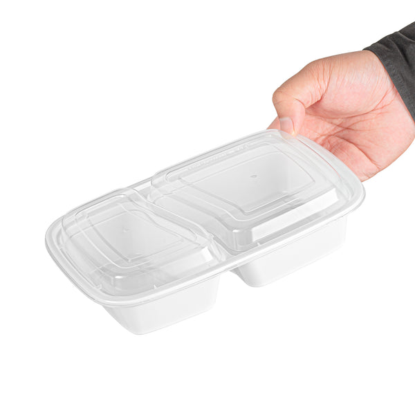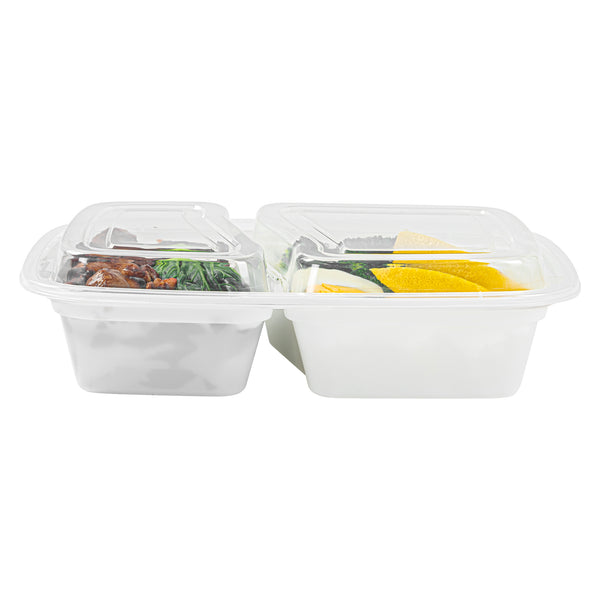 Neatly organize main meals from side dishes using our Asporto 32-ounce White Plastic 2 Compartment Food Containers. Crafted from PP plastic, these disposable takeaway boxes are BPA-free and heat-resistant, making them safe for packing a variety of food items. These meal prep containers are constructed with 2 built-in compartments that have a capacity of 12.5 and 8 ounces to efficiently separate entrees from snacks or sides. Each takeaway container is equipped with included clear plastic lids that snap onto the containers, creating a secure seal to avoid messes. Microwave-safe, these white to go boxes conveniently lets you reheat meals. These 2 compartment food containers feature a clean white finish to complement the theme or colors of your establishment. For a quick after-service cleanup, these take out boxes are disposable and recyclable to highlight the environmentally friendly practices of your foodservice establishments. These white food carry out containers measures 8.75 inches in length by 6 inches in width by 2 inches in height and have a total capacity of 32 ounces. Sold in a 100 count box.