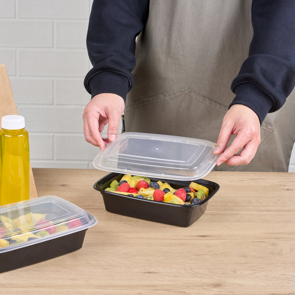 Make it easy for customers to enjoy your food now or later with our Asporto 38-ounce Rectangle Black Plastic To Go Boxes. These rectangular plastic take out containers come with coordinating lids to form a leak-resistant, spill-resistant, and mess-free seal. Plus, these containers are conveniently microwavable -- making heating up leftovers a breeze. These durable plastic to go food containers provide a mess-free and portable serving solution that's ideal for use by restaurants, cafes, food trucks, and catering companies. Plus, these black plastic containers measures 8.75 inches in length by 6 inches in width by 2 inches in height, with a capacity of up to 38 ounces. Each order will contain 100 rectangular plastic boxes and 100 clear plastic lids.