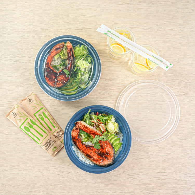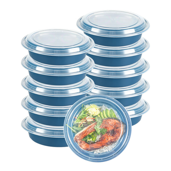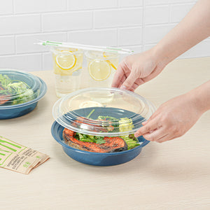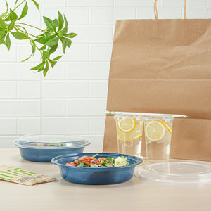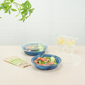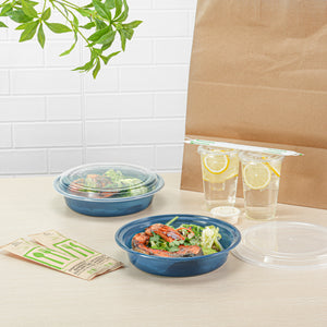 Elevate your food presentation with our Asporto 48-ounce Round Midnight Blue Plastic To Go Boxes. Equipped with a clear plastic lid, these take out containers seal tightly, preventing possible spills during delivery. These to go boxes are microwave-safe and facilitate a simple meal reheating process. Crafted from BPA-free plastic, these takeaway boxes are durable and suitable for packing various hot and cold food items. These meal prep containers boast a sleek midnight blue finish and make your take out orders visually appealing. To facilitate a simplified cleaning experience, these carry out containers are disposable and can be discarded after use. These disposable take out boxes are recyclable and ideal for eco-conscious foodservice establishments. Measuring 9 inches in diameter by 1.75 inches in height, these to go containers have a capacity of 48 ounces and offer ample space for your culinary creations. Sold in a 100 count box.