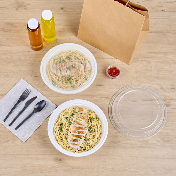 Package meals with our Asporto 48-ounce Round White Plastic To Go Boxes. These round food containers are crafted from BPA-free polypropylene plastic and are heat-resistant, making them able to hold any type of food. With a clear plastic lid, these food take out containers seals tightly, preventing possible spills during delivery. These white take out boxes are also microwave-safe, allowing for a simple meal reheating process. With a capacity of 48 ounces, these plastic to go boxes are ideal for packing sizeable meals. These takeaway containers are recyclable and disposable to provide a dual benefit by reflecting your green practices and facilitating an easy cleanup. The sleek white finish of these disposable carry out containers makes your take out orders visually appealing. Each white food box measures 9 inches in diameter by 1.75 inches in height and have a capacity of 48 ounces. Sold in a 100 count box.