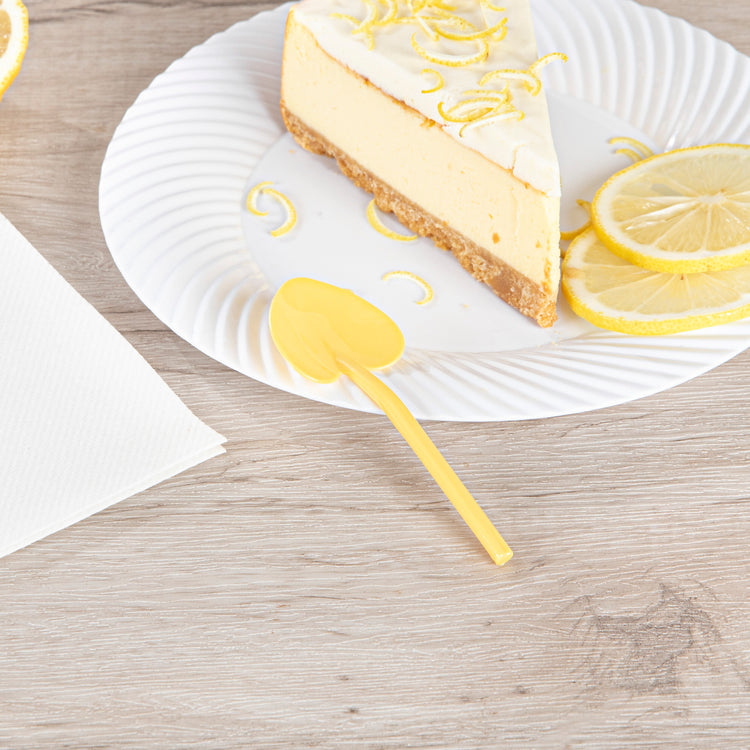 Infuse a vibrant burst of color into your sweet treats with our Coppetta Baby Yellow Plastic Love Shovel Spoons. These ice cream spoons are crafted from premium plastic and have strong, sturdy handles that do not bend or break while scooping creamy sundaes. Featuring an eye-catching yellow finish, these dessert spoons will make your cups of perfectly swirled frozen yogurt and freshly scooped ice cream stand out. These plastic spoons have a stylish shovel-shaped head, making it easy to scoop up frozen and creamy desserts. For an easy cleanup, these tasting spoons are disposable. These disposable spoons measure 3.5 inches in length by 1.25 inches in width. Shipped in a 100 count box.