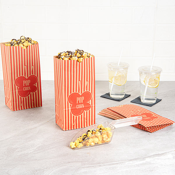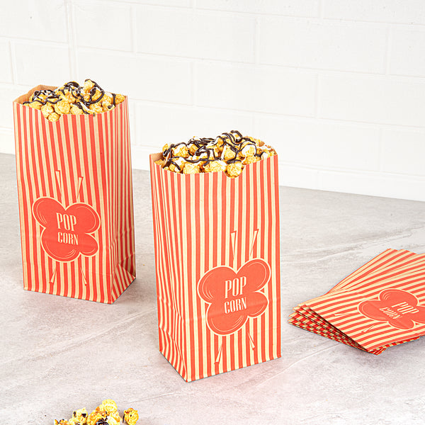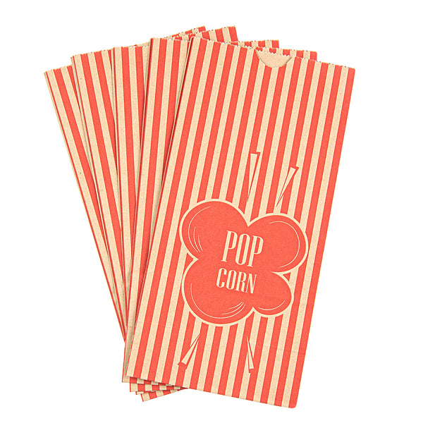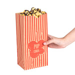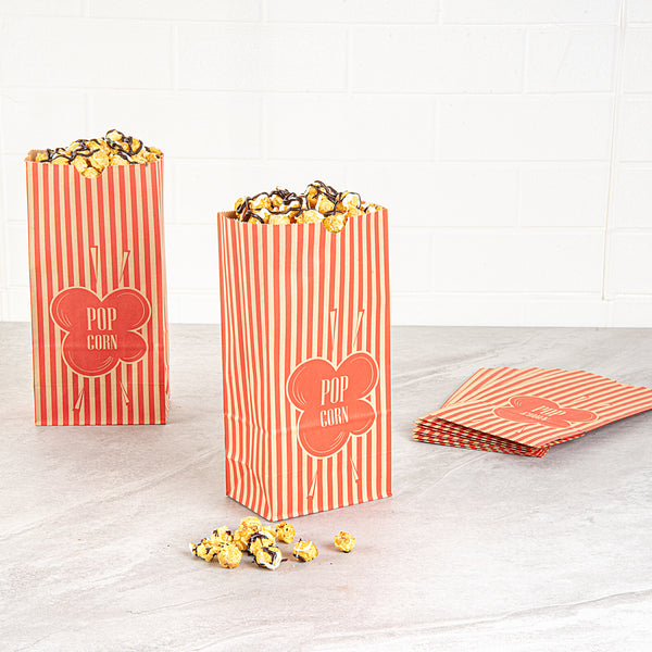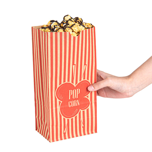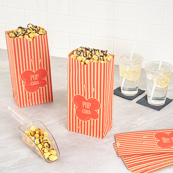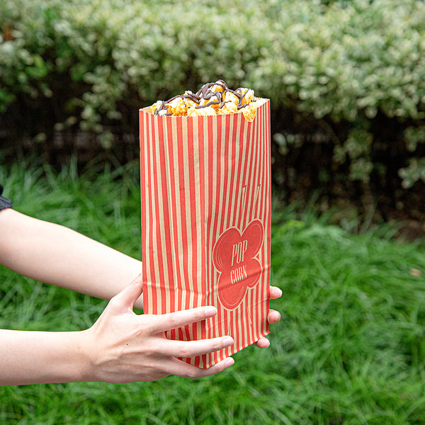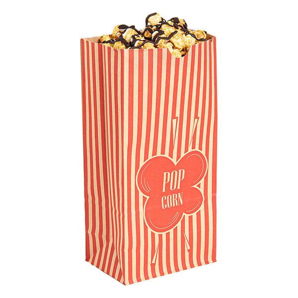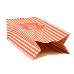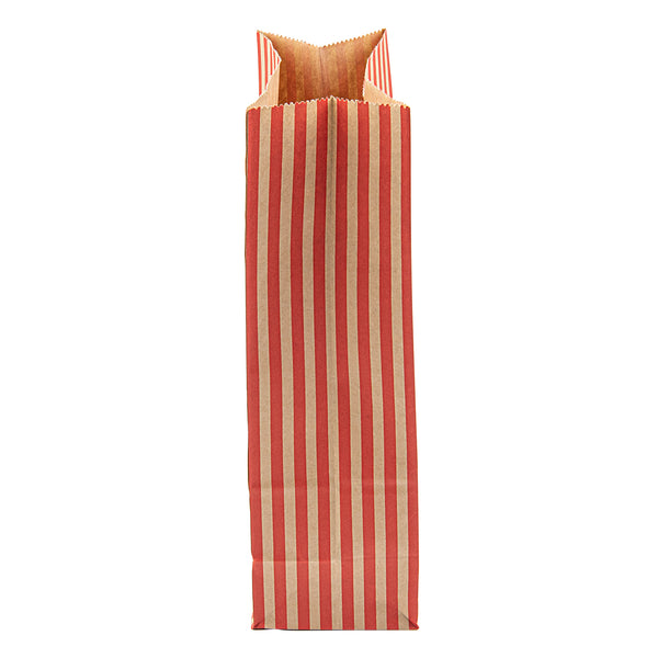 Comfortably serve your delicious popcorn in our Bag Tek 1-ounce Red and Kraft Paper Popcorn Bags. Accented with a striking red and kraft stripe design, these popcorn bags offer a trendy and nostalgic ambiance to your snack presentation. Thanks to a silicone oil lining, these bags are resistant to grease leakage, ensuring buttery popcorn will not dampen the bag's surface. The square base design keeps these snack bags upright, making it a breeze to add scrumptious toppings to your snacks. Perfect for both hot and cold snack options, these movie popcorn bags are a valuable addition to snack stands, concession stands, or cinema premises. With an accessible open-top design, these paper popcorn bags allows customers can easily access their delightful treat. Clean-up is a breeze with these biodegradable and commercially compostable popcorn bags. Measuring 4.25 inches in length, 2.25 inches in width, and 9.5 inches in height, these red and kraft-colored bags can hold 1 ounce of popcorn. Sold in a 100 count box. These item will only degrade outside of the traditional solid waste stream.