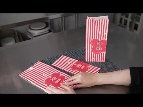 Customers can easily snack on their popcorn with our Bag Tek 1-ounce Red Paper Popcorn Bags. Featuring a red and white striped finish, these paper snack bags give your servings of popcorn a classic look. These paper food bags are tear-resistant and have a grease-resistant lining so customers can add butter to their popcorn without worry about having greasy hands. The flat bottom of these red and white paper bags makes it easy to place them on flat surfaces and fill them with popcorn. With an open-top design, these treat bags provide easy access to popcorn while on the go, making them great for food stands, festivals, and movie theaters. Plus, they can be folded down for securely containing popcorn. For quick cleanup, these paper bags can be conveniently recycled. Measuring 4.33 inches long by 2.36 inches wide by 9.44 inches tall, these red paper bags contain up to 1 ounce of popcorn. Sold in a 100 count box.