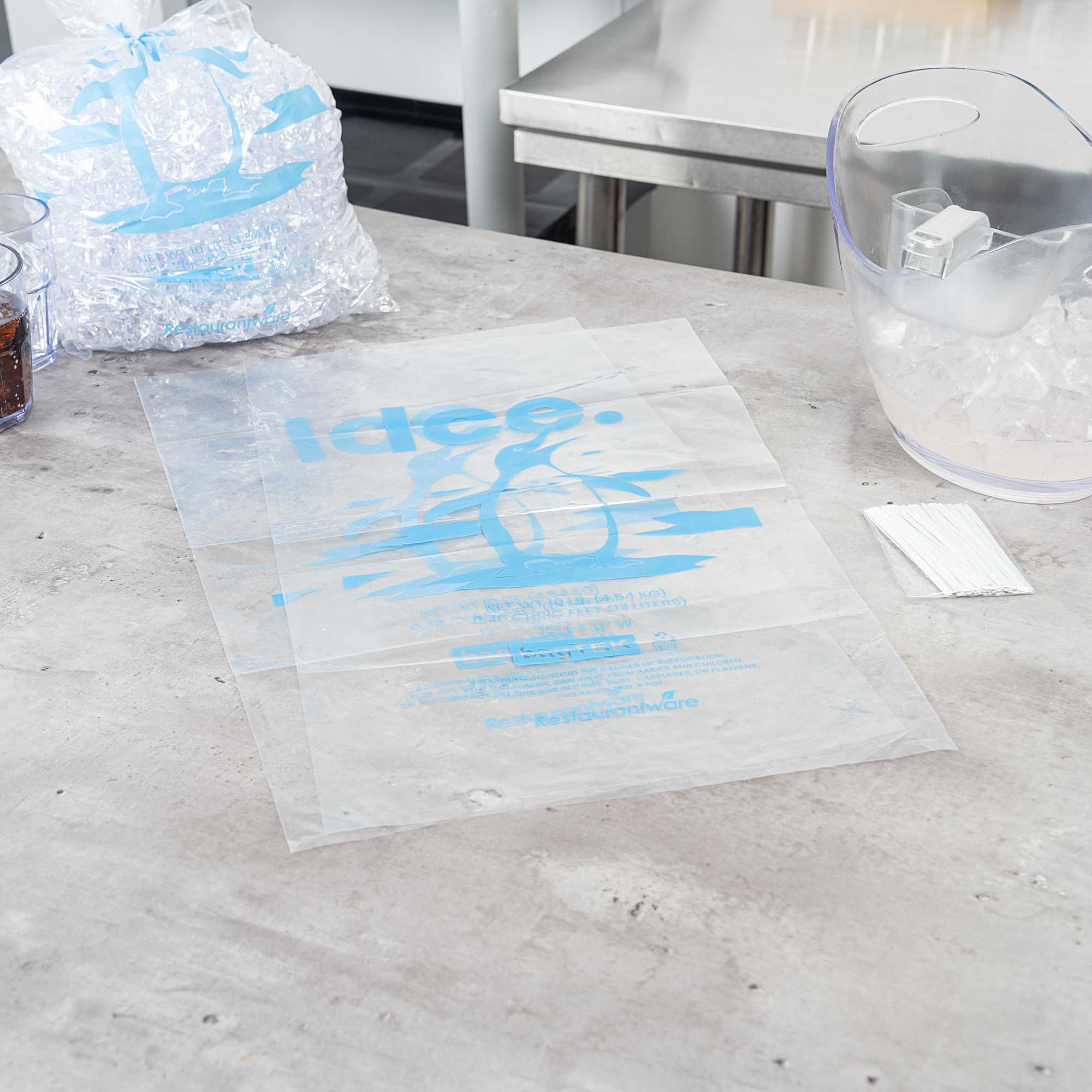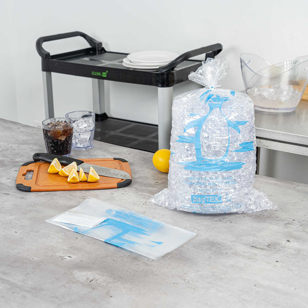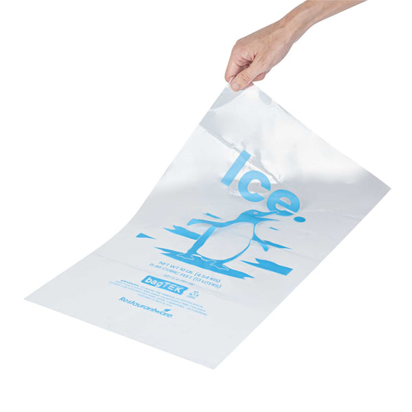 Ensure secure and efficient ice handling with our Bag Tek Clear Plastic Ice Bags. With a 10-pound capacity, these bags are ideal for convenience stores, foodservice operations, and ice vendors seeking a dependable storage solution. Engineered to be freezer-safe, they help maintain ice integrity during transport and storage. Made from durable plastic enhanced with metallocene, they resist leaks and tearing to keep ice clean and contained. The bold ice print and transparent design provide easy identification and a professional presentation. Each bag measures 12.01 inches in length by 21.06 inches in width, perfectly sized for 10-pound portions of ice. Sold in a 1000 count box.