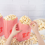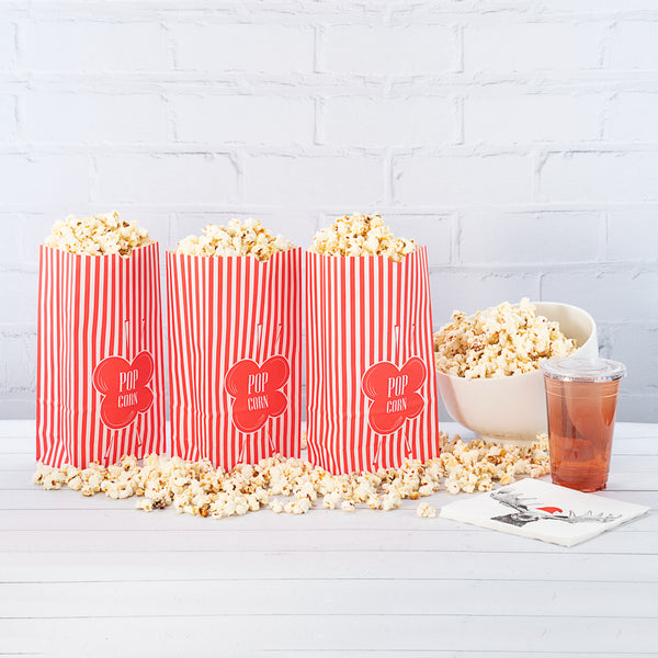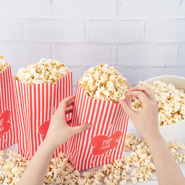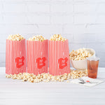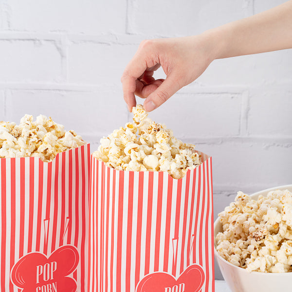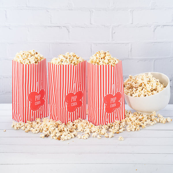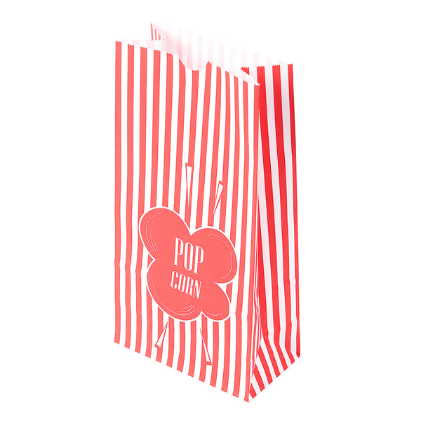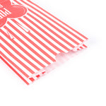 Easily fill our Bag Tek 2-ounce Red Paper Popcorn Bags with your customers' favorite type of popcorn. Designed with a red and white striped finish, these paper snack bags allow you to create a stylish and classic snack presentation. With a grease-resistant lining, these paper food bags prevent oils from seeping through when filled with buttery popcorn. Featuring a flat bottom, these white paper bags can stand upright for quickly adding caramel, chocolate, or butter to popcorn. Great for food stands or movie theatres, the open-top design of these treat bags allows customers to easily access their snacks. These paper bags are recyclable for simple and easy clean up after use. Measuring 5.25 inches long by 3 inches wide by 10 inches tall, these red paper bags hold up to 2 ounces of popcorn. Sold in a 100 count box.