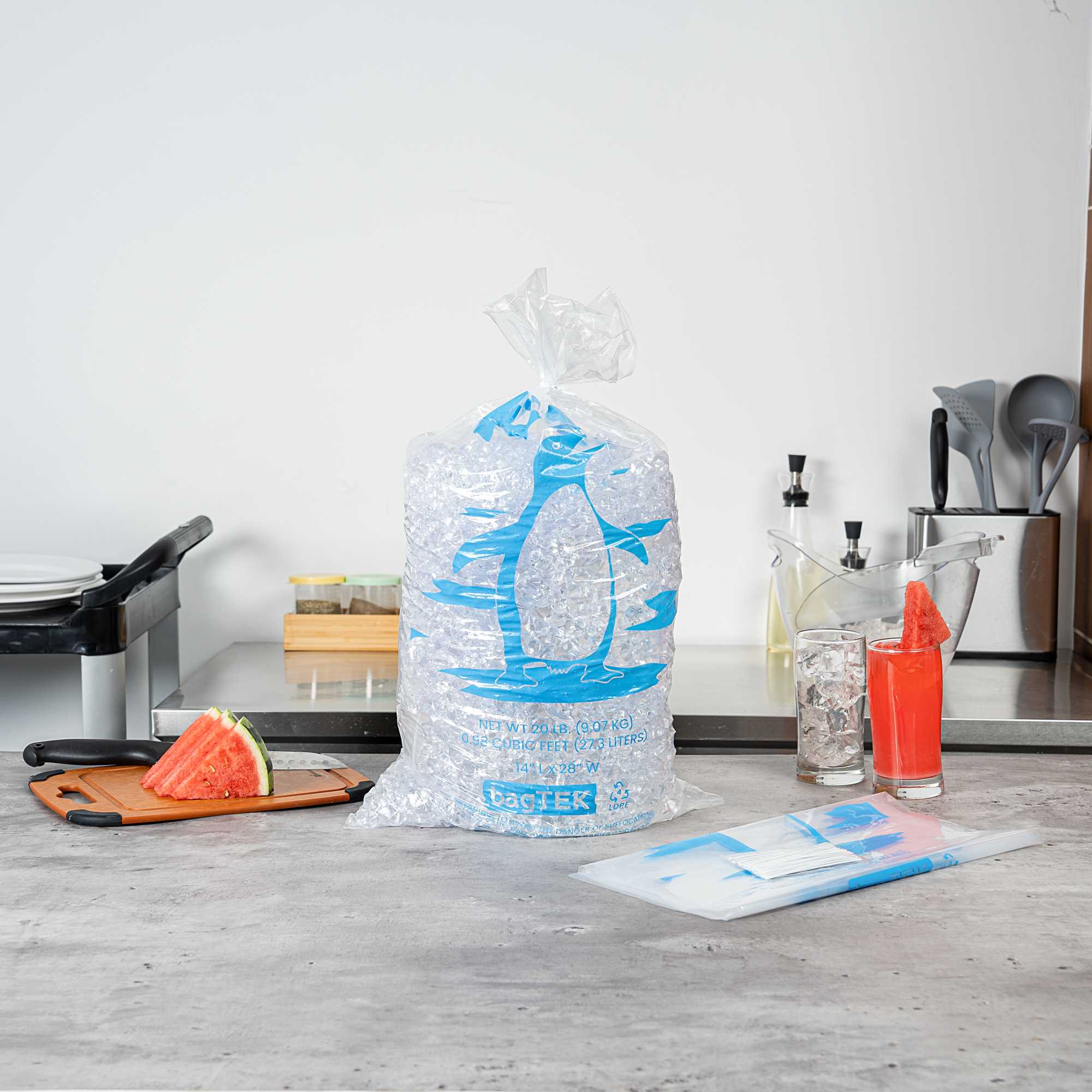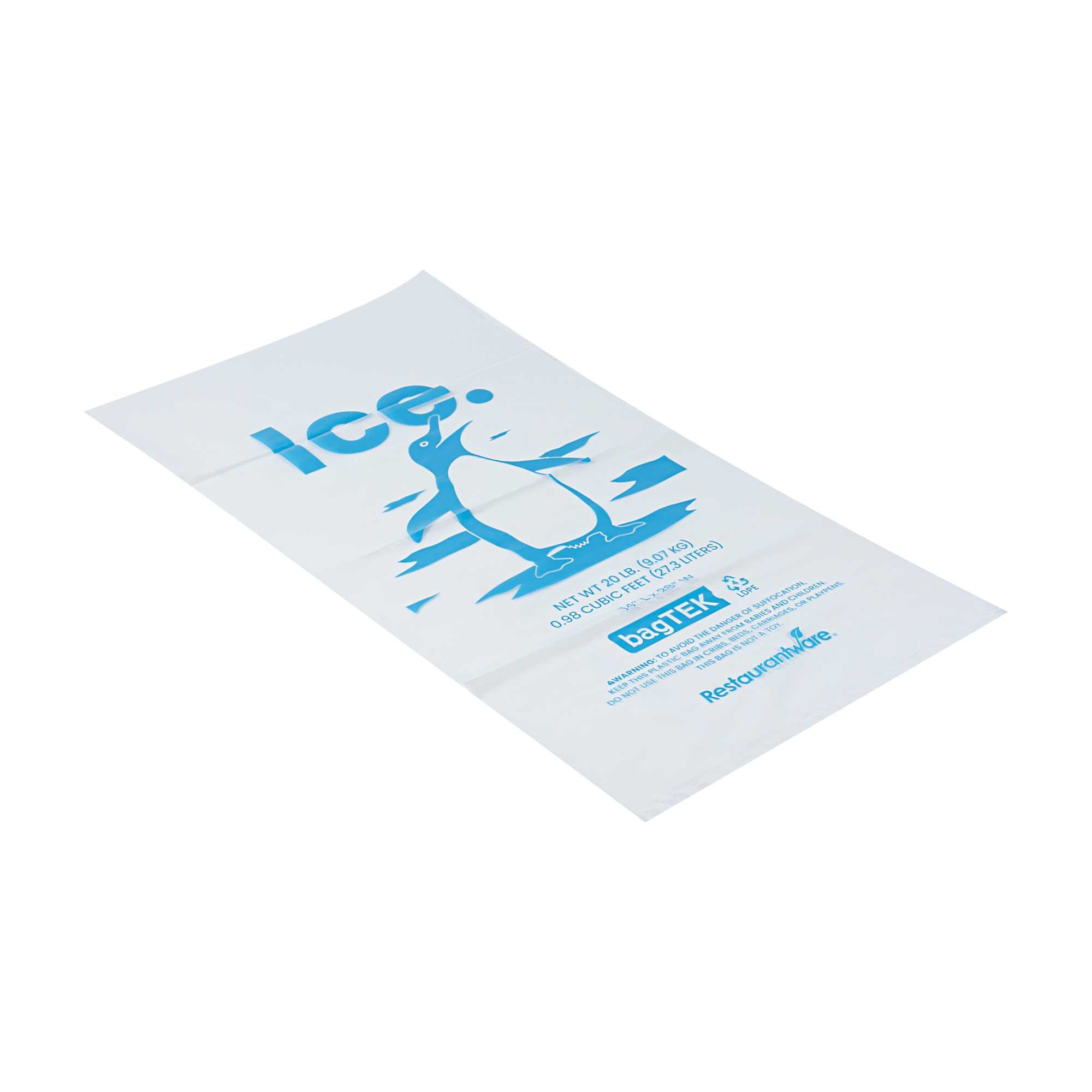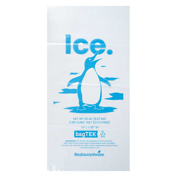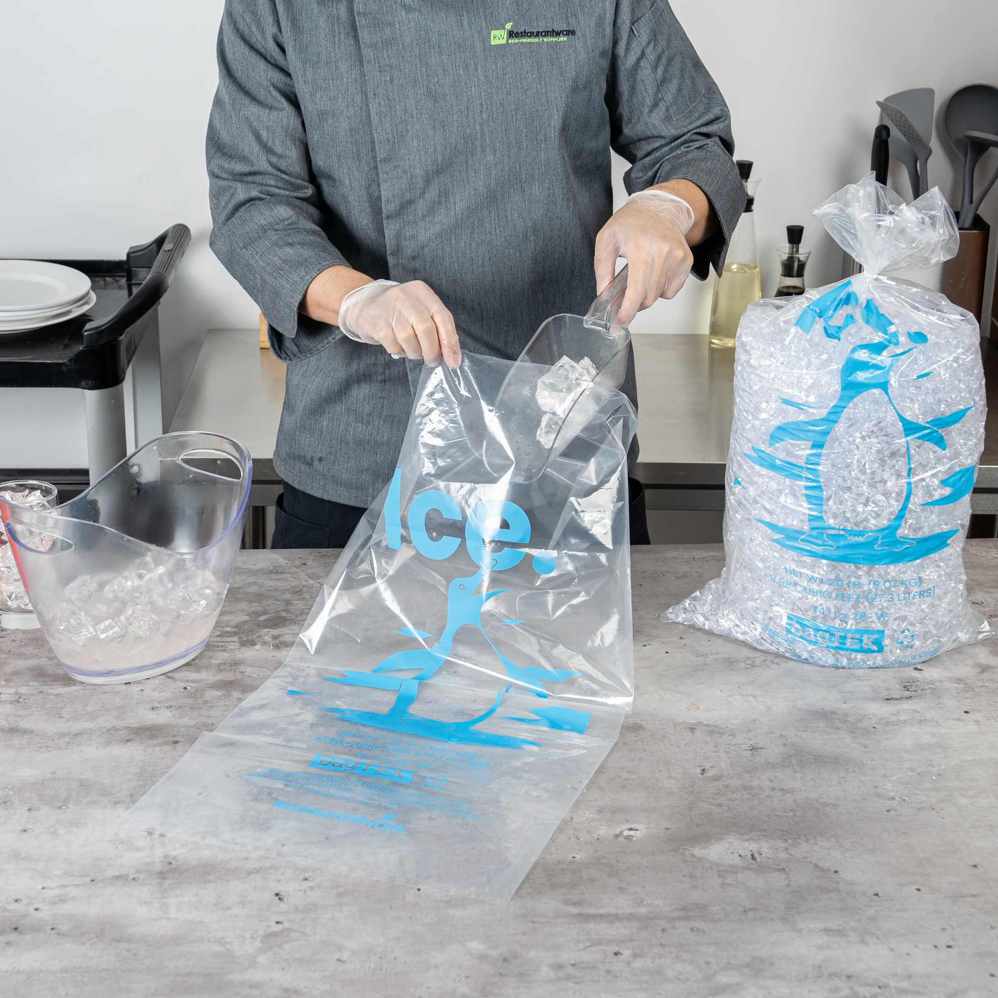 Transport bulk ice securely with our Bag Tek Clear Plastic Ice Bags. Built for a 20-pound capacity, these freezer-safe bags are perfect for restaurants, caterers, and cold storage operations. Constructed with heavy-duty plastic fortified with metallocene, they offer excellent resistance to punctures and leaks. The vibrant ice print and clear finish allow for quick identification, enhancing organization and efficiency. Designed for high-volume use, these bags measure 14.02 inches in length by 28.15 inches in width and accommodate up to 20 pounds of ice with ease. Sold in a 500 count box.