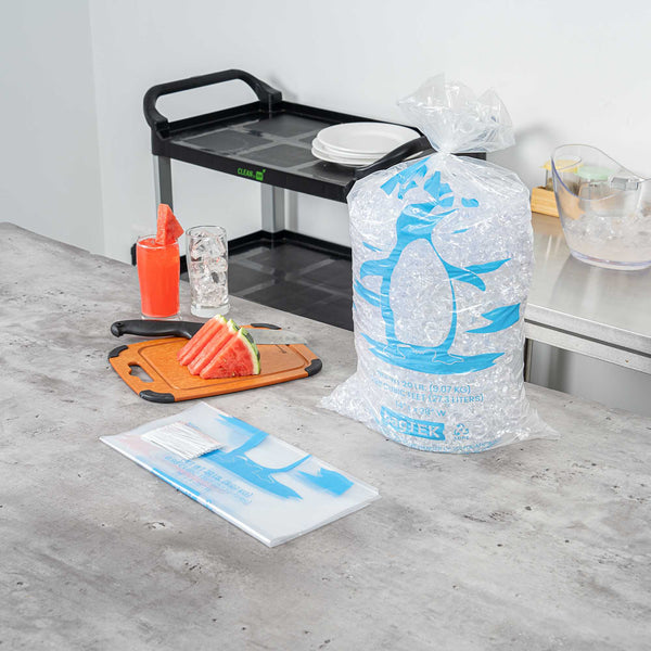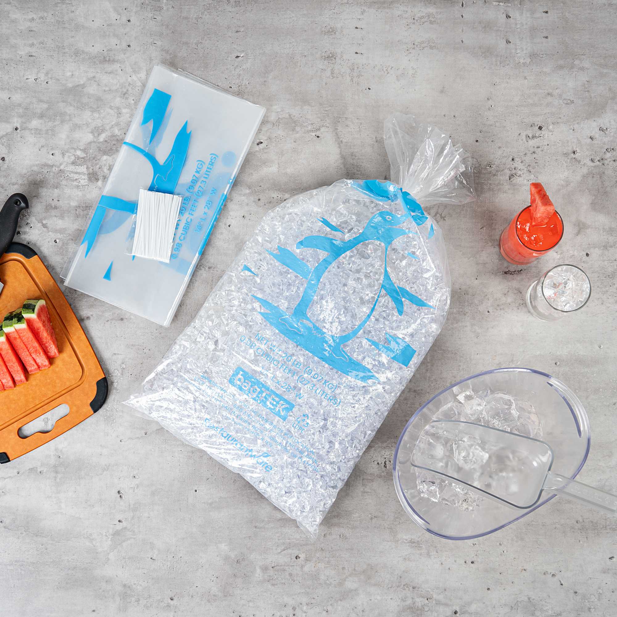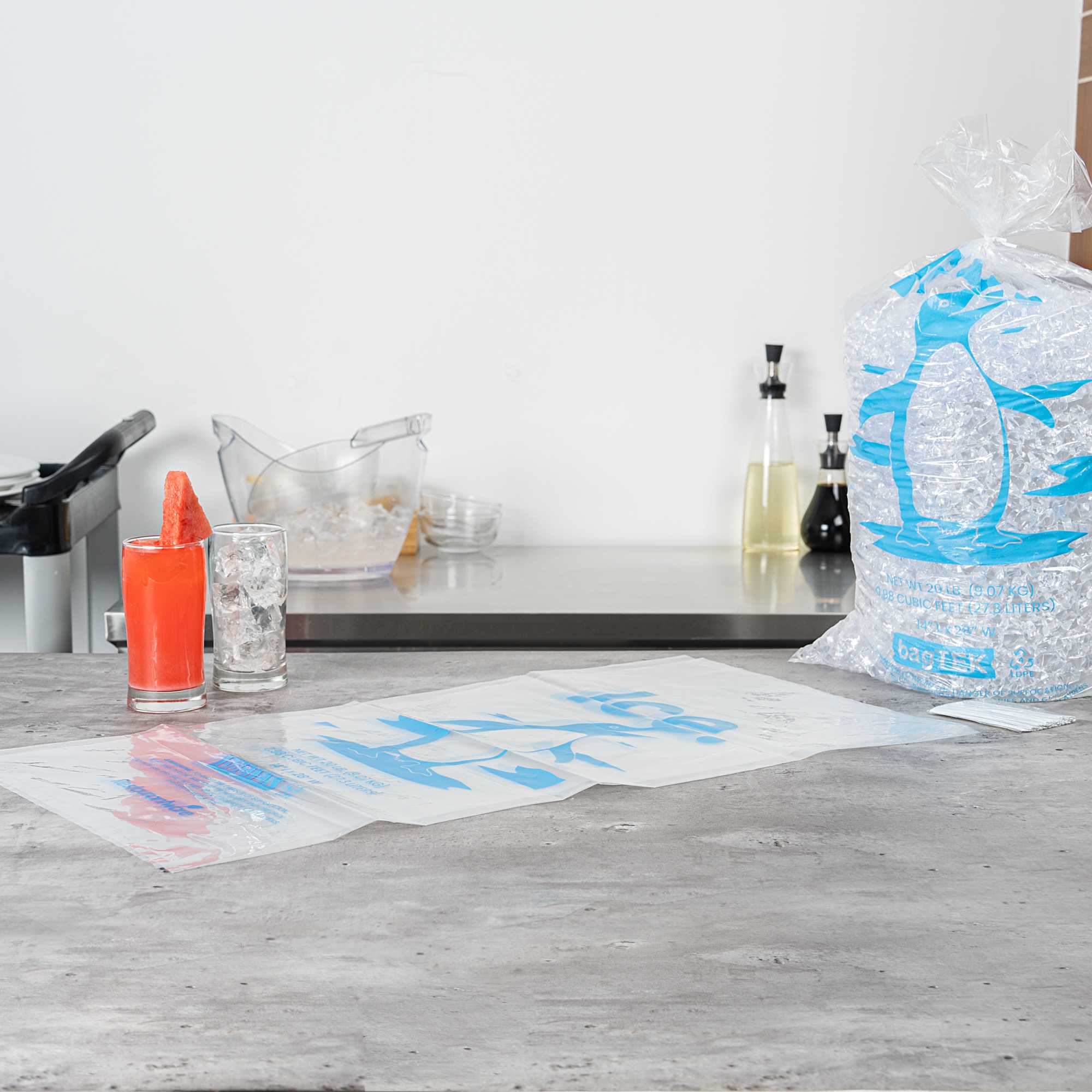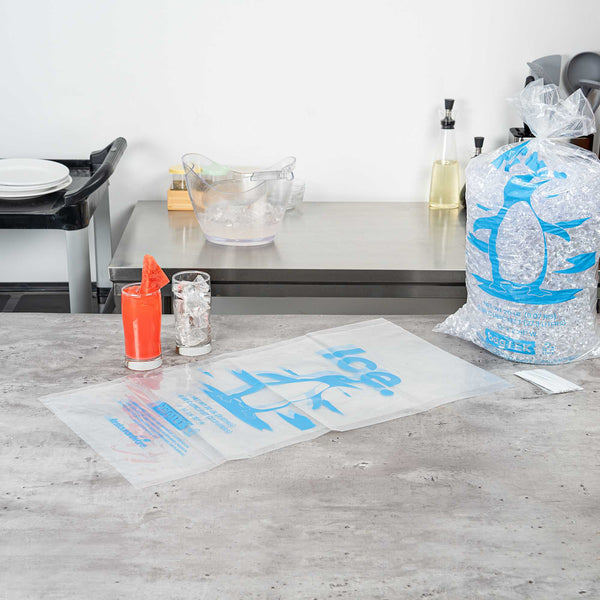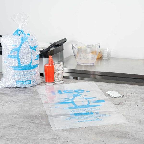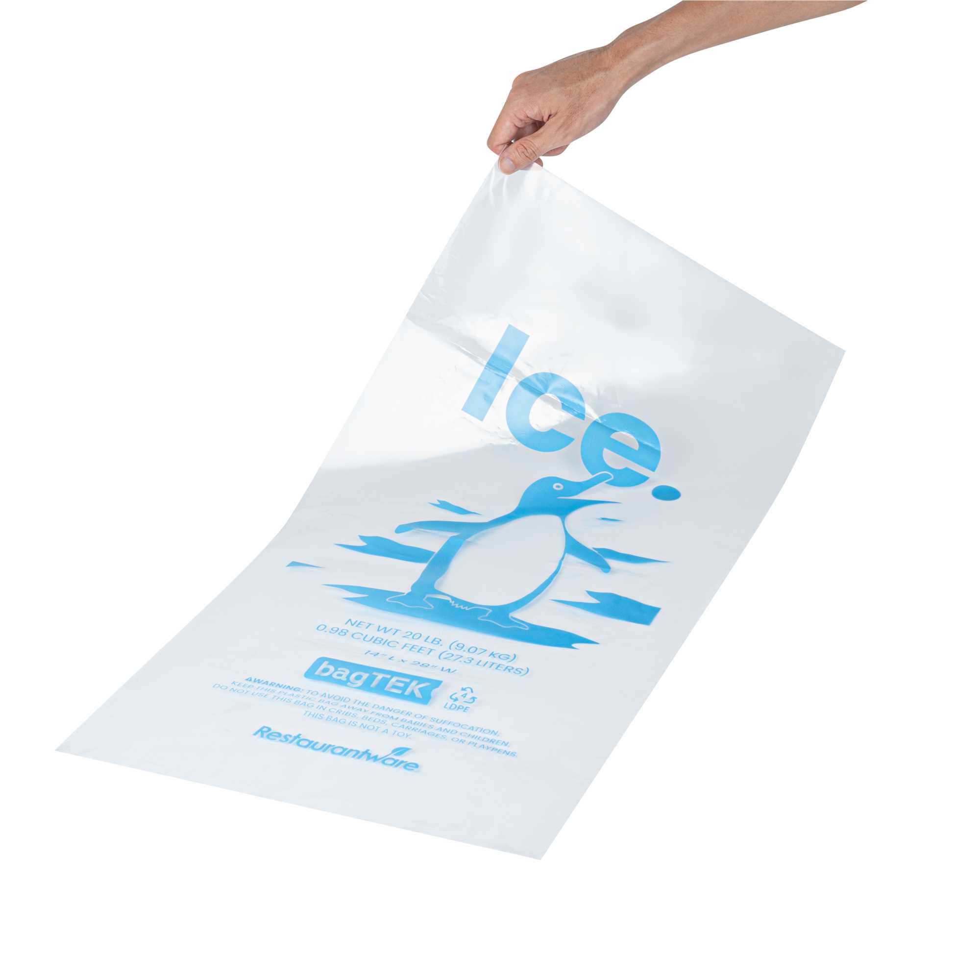 Transport bulk ice securely with our Bag Tek Clear Plastic Ice Bags. Built for a 20-pound capacity, these freezer-safe bags are perfect for restaurants, caterers, and cold storage operations. Constructed with heavy-duty plastic fortified with metallocene, they offer excellent resistance to punctures and leaks. The vibrant ice print and clear finish allow for quick identification, enhancing organization and efficiency. Designed for high-volume use, these bags measure 14.02 inches in length by 28.15 inches in width and accommodate up to 20 pounds of ice with ease. Sold in a 500 count box.