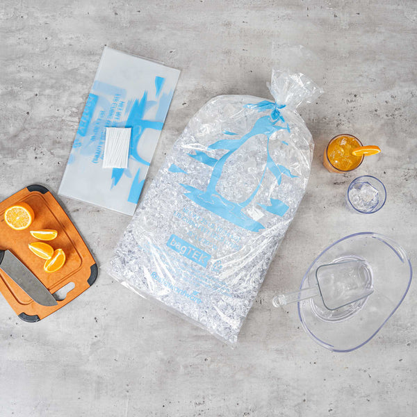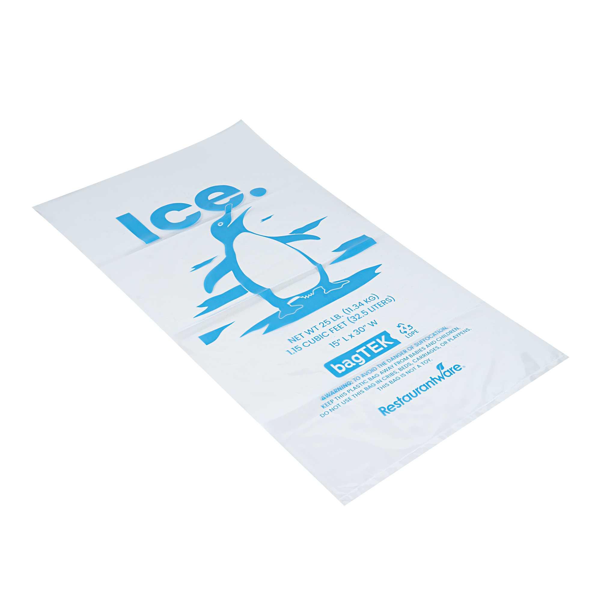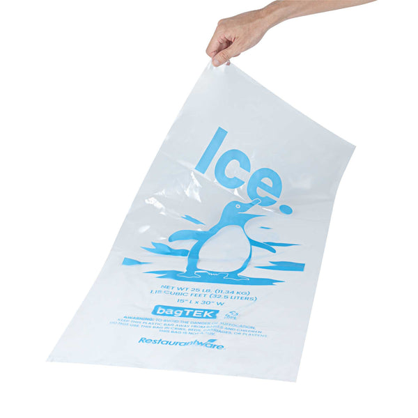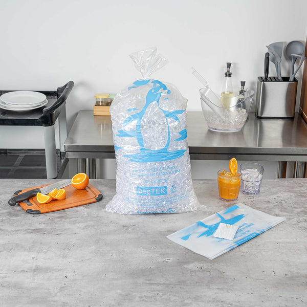 Keep ice fresh and secure with our Bag Tek Clear Plastic Ice Bags. Featuring a 25-pound capacity, these heavy-duty bags are ideal for commercial kitchens, event caterers, and ice distribution services. Made from rugged plastic reinforced with metallocene, they’re freezer-safe and highly resistant to leaks or tearing during transport. The eye-catching ice print and clear design enhance both presentation and product visibility. Each bag measures 14.96 inches in length by 30.12 inches in width to comfortably accommodate 25 pounds of ice. Sold in a 500 count box.