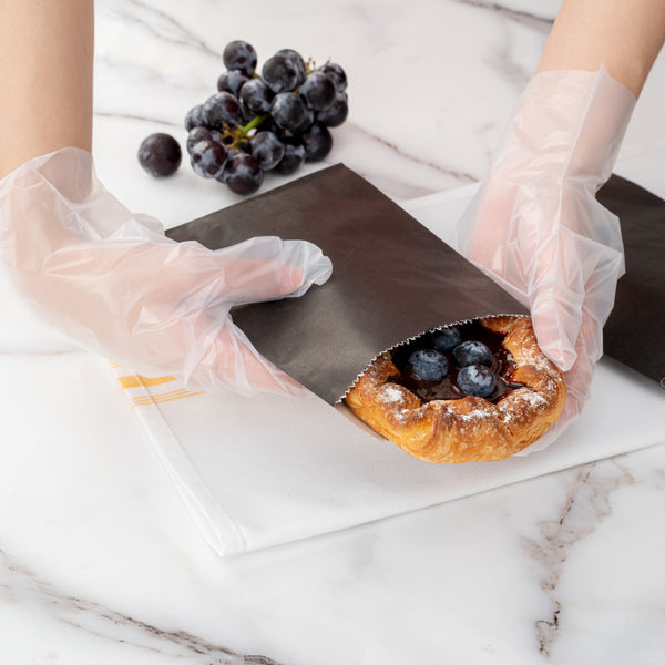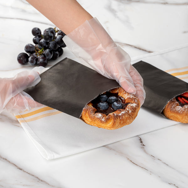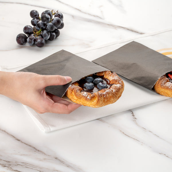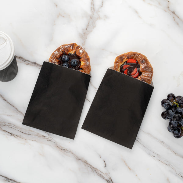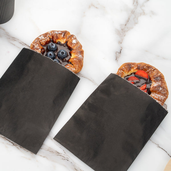 Pack up your baked goods with our Bag Tek Black Paper Bags. The open-pouch design of these sustainable bags allows customers to enjoy their snacks while on the go. Made from greaseproof paper, these paper lunch bags stay without oily stains, making them ideal for serving donuts, scones, or cookies. Designed with a black finish, these to go bags match perfectly with any of your take out supplies. These black snack bags can be sustainably disposed of to shorten the cleaning process at your bakery or catering service. These paper deli bags measure 7 inches long and 5 inches wide. Sold in a 100 count box.