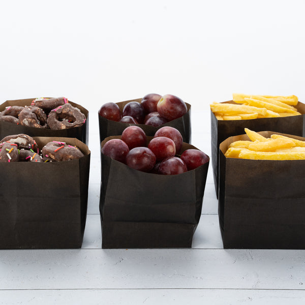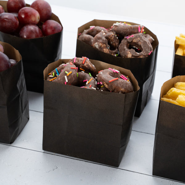 Maintain snack freshness with versatile black paper snack bags. These bags are designed to ensure mess-free serving of pastries and other treats. Their food bags construction supports both cold and hot food items, making them an ideal choice for diverse menu offerings while ensuring a sleek, modern presentation. The flat-bottom design further enhances their utility by allowing them to stand upright, facilitating easy packaging and display. Elevate your foodservice operation with these efficient and stylish snack bags. Each order includes 100 Bag Tek Black Paper Snack Bags.