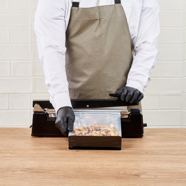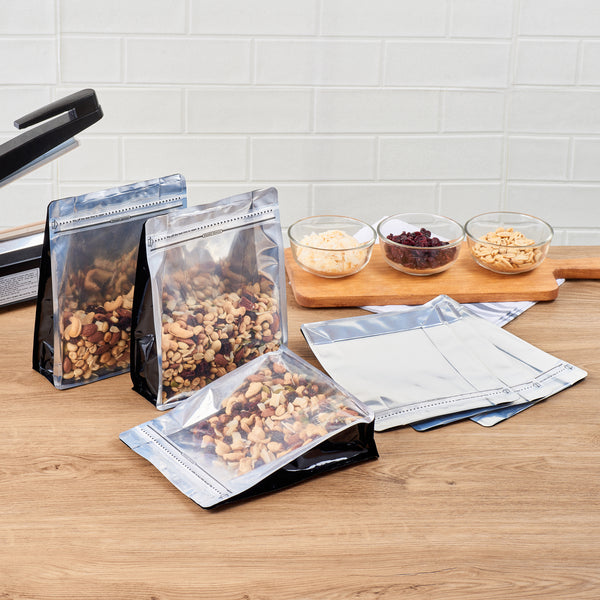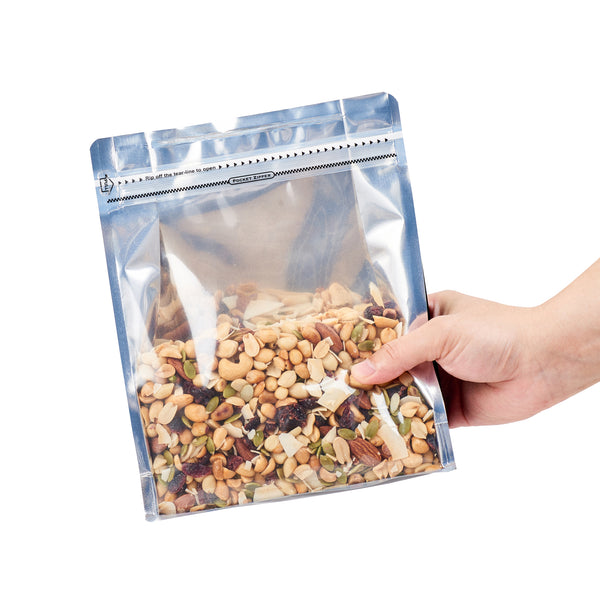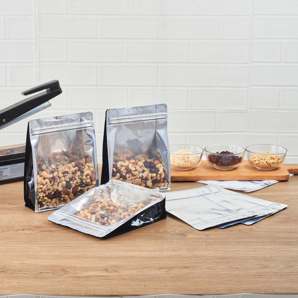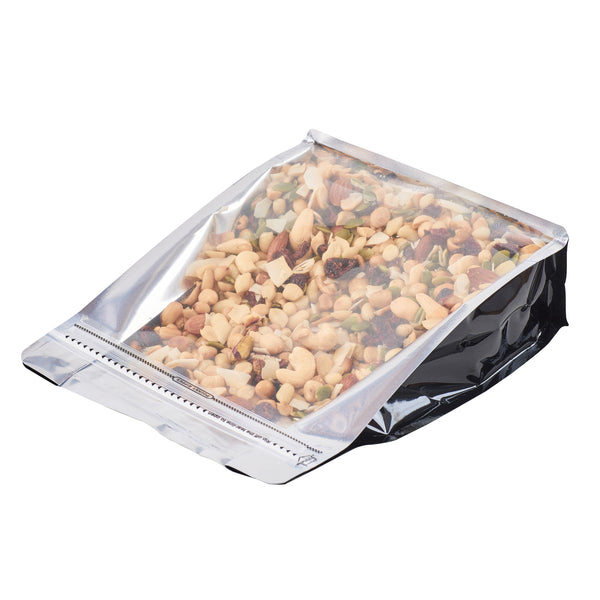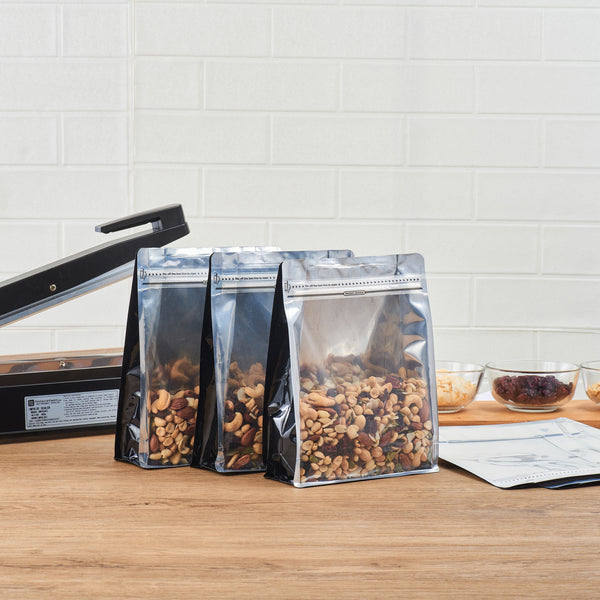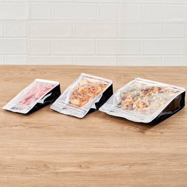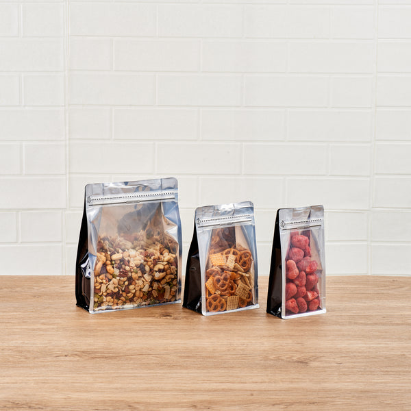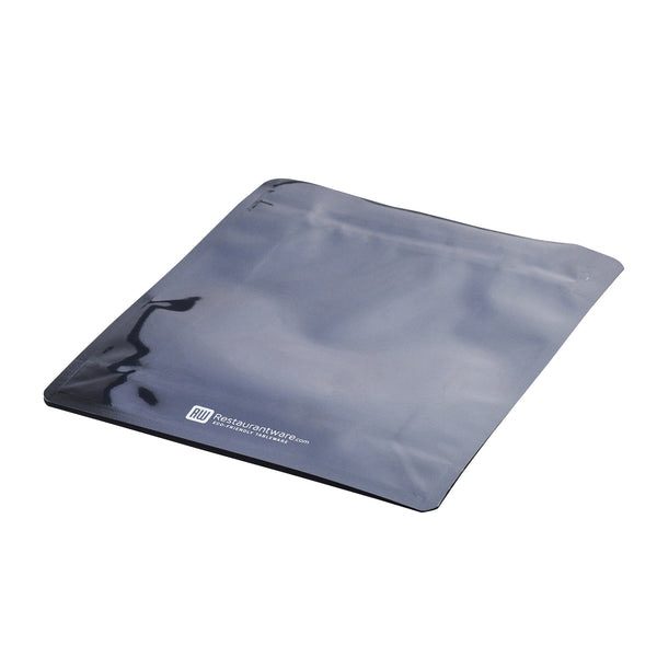 Take your food packaging to the next level with our Bag Tek Black Plastic Large Snack Bags. Featuring a double seal for protection, the rip lock ensures the freshness of the treats is preserved after the heat seal is broken. These flat-bottomed heat-seal bags are perfect for food displays at grab-and-go areas of restaurants and cafes, food stalls, and kiosks, as they can stand alone without support. With a transparent window, the contents of these plastic pouches for dry snacks do not have to be opened since they are visible to the customers. These plastic pouches have a greaseproof feature that helps avoid grease and oils from leaking out into clothes and furniture. A must-have for all kitchens, these plastic packaging bags feature gussets on the sides, allowing them to hold many sweet and salty treats. Displaying classy black packaging, each plastic snack bag measures 9.5 inches in length by 7.5 inches in width by 2.75 inches in height. Sold in a 100 count box.