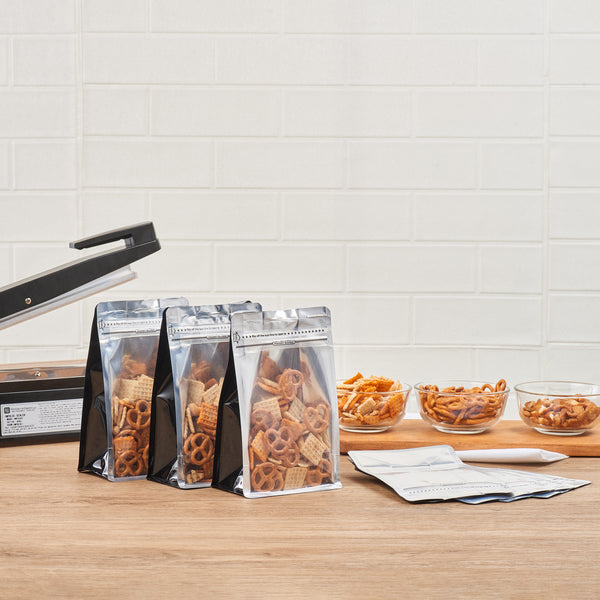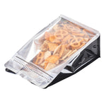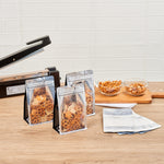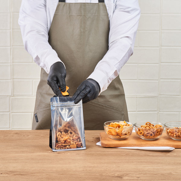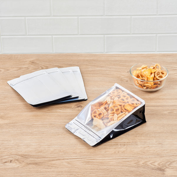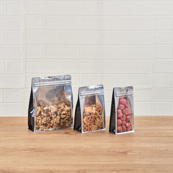 Upgrade from your standard packaging to efficient packaging with our Bag Tek Black Plastic Medium Snack Bags. With the double-sealing feature of these rip-lock bags, you can store your sweet and savory snacks for a long time while preserving their freshness. The rip lock design added with the heat sealable feature makes these plastic bakery bags secure. These heat-seal bags have a flat bottom design allowing them to stand alone without support, and are ideal for grab-and-go areas of restaurants and cafes, food stalls, and kiosks. A must-have for all kitchens, these greaseproof plastic pouches help avoid oil spills by keeping the oils and the grease from seeping through. The gussets on the sides of these plastic bakery bags enable them to hold a substantial amount of snacks. Featuring an elegant black finish to complement any setting, each large cookie bag measures 8 inches in length by 5 inches in width by 3.25 inches in height. Sold in a 100 count box.