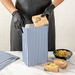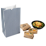 Effortlessly package orders using our Bag Tek Blue and White Stripe Paper Bags. With a 12-pound capacity, these take out bags are perfect for family-sized meals and groceries. Made from premium paper, these merchandise bags are sturdy with a grease-resistant coating to prevent oil or sauce from seeping through and making a mess. The stylish blue and white stripes of these paper deli bags seamlessly match your restaurant's take out supplies. To easily store your leftovers, these disposable paper bags are freezer-safe. These disposable lunch bags have an open-top design that enables quick packaging, while the fold-down feature holds meals securely and maintains a tidy carry-out experience. For quick cleanup, these paper grocery bags are disposable. The flat bottom design of these striped paper bags ensures stability and self-standing support on surfaces. Each disposable grocery bag has a capacity of 12 pounds and measures 7 inches in length by 4.25 inches in width by 12.5 inches in height. Shipped in a 100 count box.