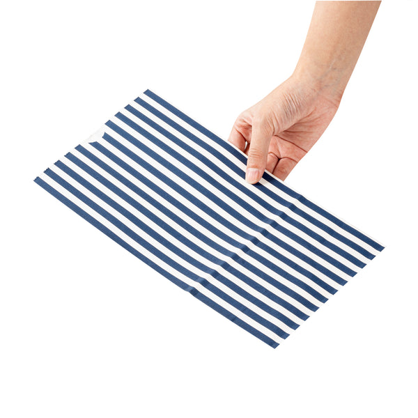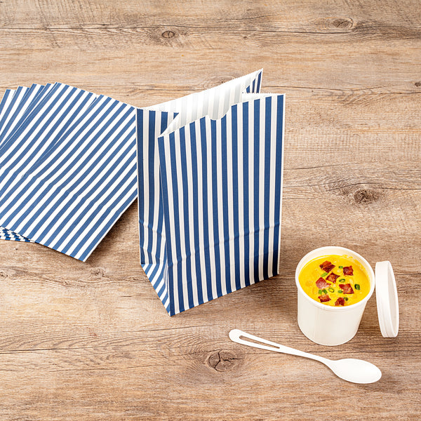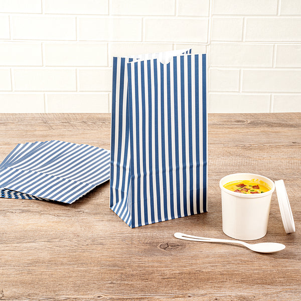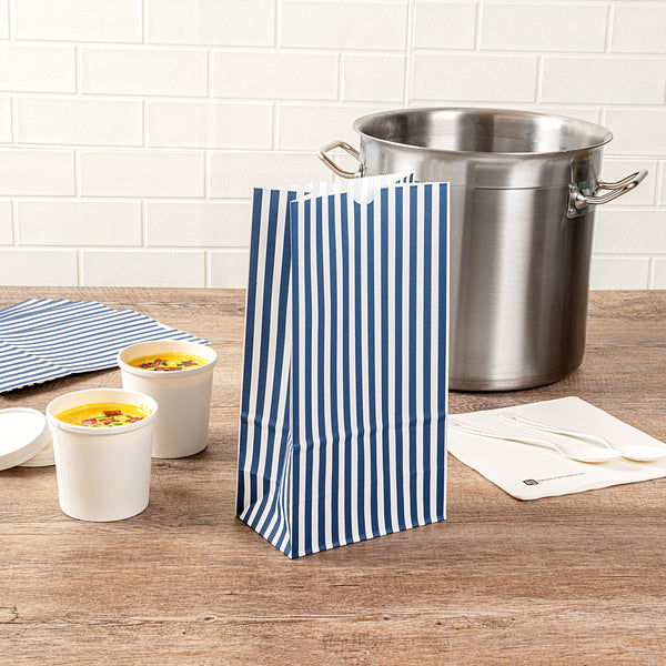 Serve your take out orders in style with our Bag Tek Blue and White Stripe Paper Bags. Crafted from high-quality paper, these disposable deli bags are durable with a grease-resistant coating to keep away oily mess. These paper deli bags are capable of securely holding up to 6 pounds of meals and treats. Featuring an open-top design, these merchandise bags ensure uncomplicated access to the contents and can be conveniently folded to carry the food spill-free. With a flat base, these popcorn bags maintain upright stability for bagging convenience. The blue and white stripes of these disposable lunch bags perfectly complements your take out collection. To easily store your leftovers, these disposable paper bags are freezer-safe.These paper take out bags are disposable for quick cleanup.Each take out bag has a capacity of 6 pounds and measures 6 inches in length by 3.5 inches in width by 10.75 inches in height. Shipped in a 100 count box.