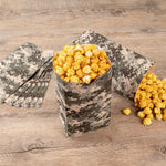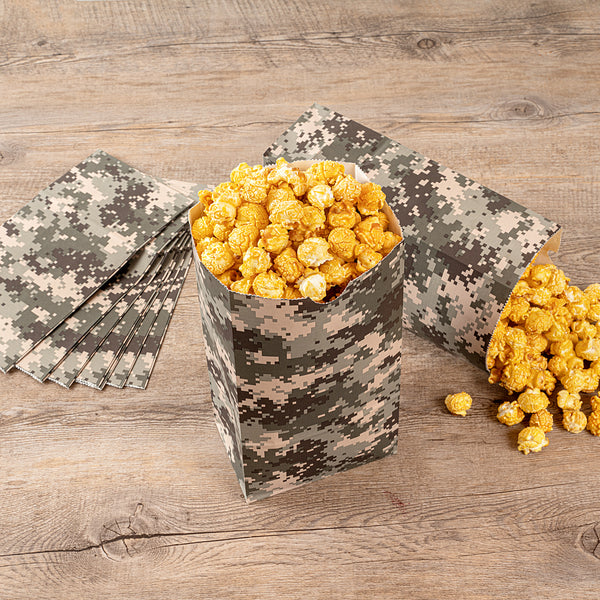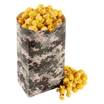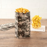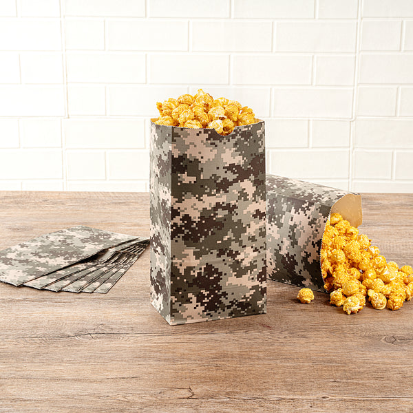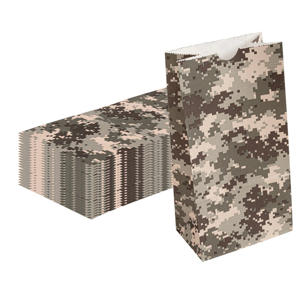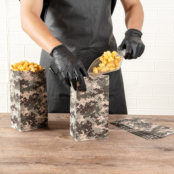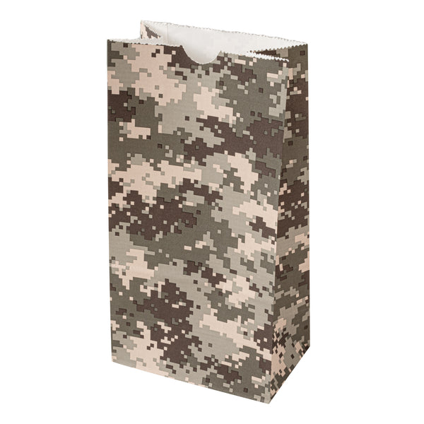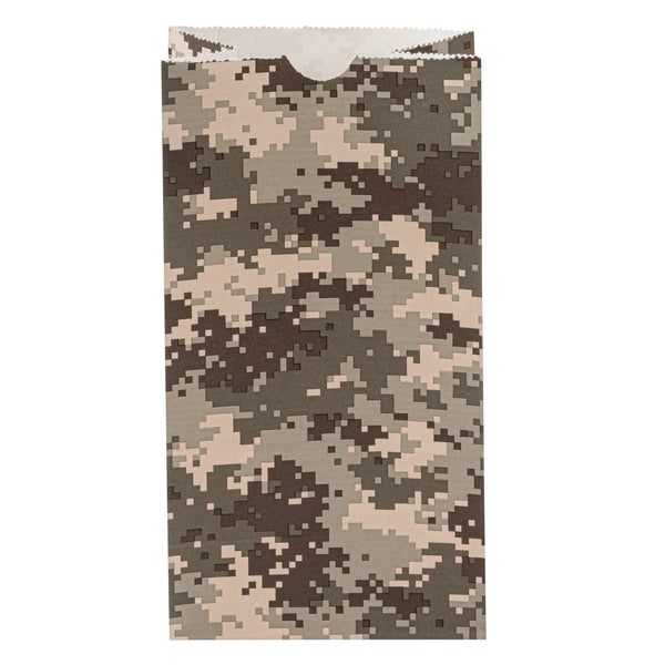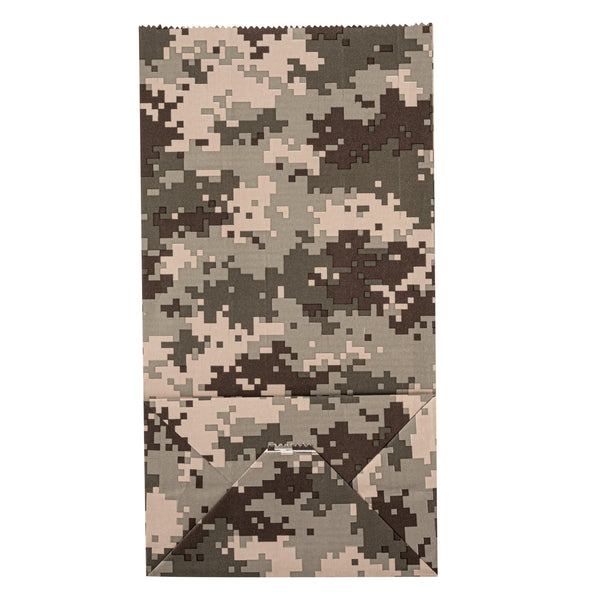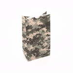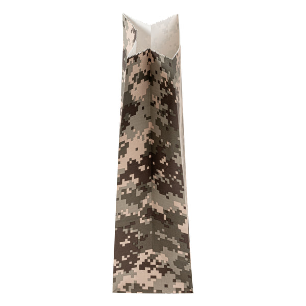 Upgrade your takeaway packaging with our Bag Tek Camouflage Paper Bags. Made from sturdy paper, these disposable lunch bags are durable and equipped with a grease-resistant coating to prevent oils and sauces from seeping through. The unique camouflage print of these take out bags adds a playful feel to takeout orders. With an open-top design, these popcorn bags can be folded to secure contents during travel. These paper deli bags are freezer-safe, and make storing leftovers straightforward for customers. The rectangular flat base of these merchandise bags allows for easy packing by standing upright without help. These camouflage bags are disposable and ensures cleanup is a breeze. The gusset sleeves of these durable paper bags provide additional space for larger meals. Each disposable paper bag has a capacity of 4 pounds and measures 5 inches in length by 3.25 inches in width by 9.5 inches in height. Shipped in a 100 count box.