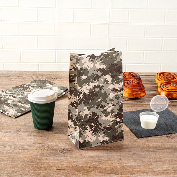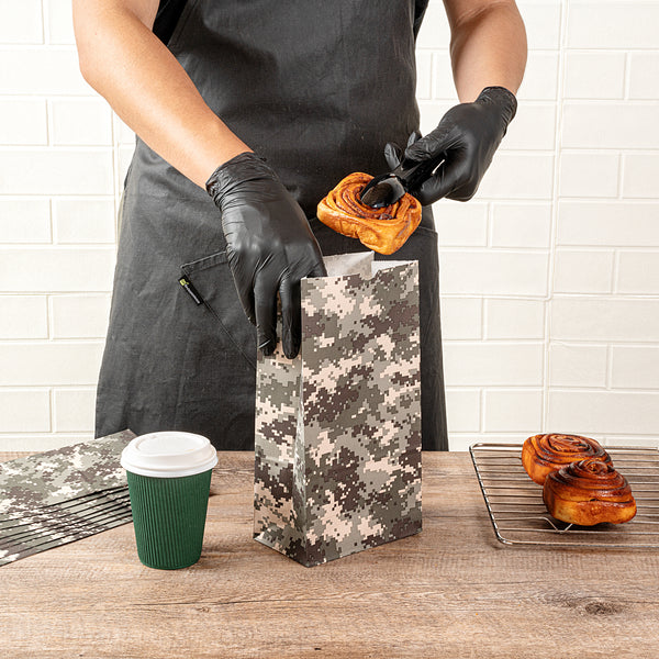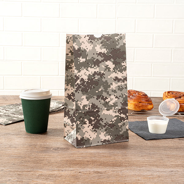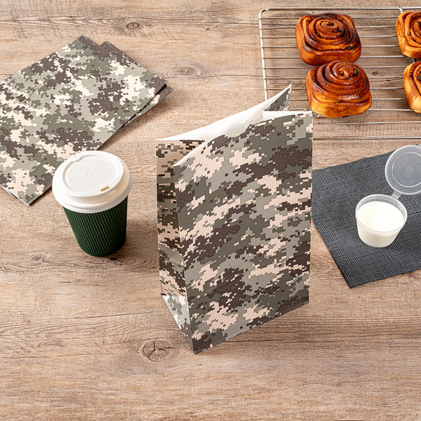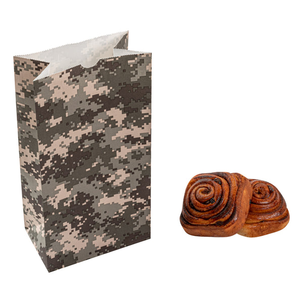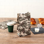 Present your take out orders in our Bag Tek Camouflage Paper Bags. Crafted from high-quality paper, these disposable deli bags are durable with a grease-resistant coating to keep away oily mess. These merchandise bags can accommodate up to 6 pounds of your customers' favorite meals and snacks. The open-top design of these paper deli bags allows quick access and clean folding for on-the-go dining without any hiccups. To easily store your leftovers, these disposable paper bags are freezer-safe. The flat bottom design of these popcorn bags provide upright stability for convenient packing. These disposable lunch bags have a unique camouflage pattern that seamlessly merges with your take out supplies. These paper take out bags are disposable for quick cleanup. Each take out bag has a capacity of 6 pounds and measures 6 inches in length by 3.5 inches in width by 10.75 inches in height. Shipped in a 100 count box.