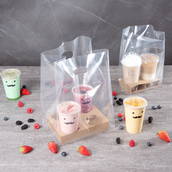 Crafted from high-quality LDPE plastic, these plastic take out bags can reliably hold the weight of various drinks and meals. Take your orders on the go.