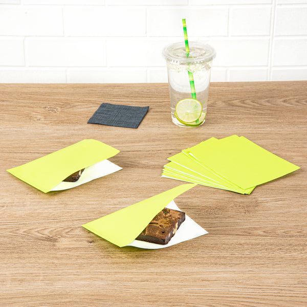 Indulge in your snacks conveniently with Bag Tek Eco Green Paper Small Double Open Bags. These sandwich wrappers are expertly crafted from top-quality paper, featuring a double-open design that makes them versatile for both lining cone baskets and securely wrapping handheld food items. Fitted with a greaseproof PE lining, these double-open bags are well-suited for various foods, effectively preventing oily stains and ensuring a tidy presentation. The green exterior of these deli wrap liners instantly elevates the visual appeal of your food displays. For the convenience of reheating, these deli paper sheets are microwave-safe, allowing for a quick warm-up in just up to 2 minutes. Furthermore, these microwave-safe paper bags align with eco-friendly practices, as they are recyclable, aiding in the reduction of your food establishments carbon footprint. Each paper snack wrap measures 6.25 inches in length by 4.75 inches in width. Available in a package of 100 counts