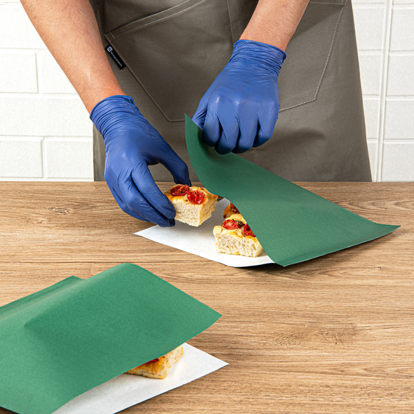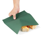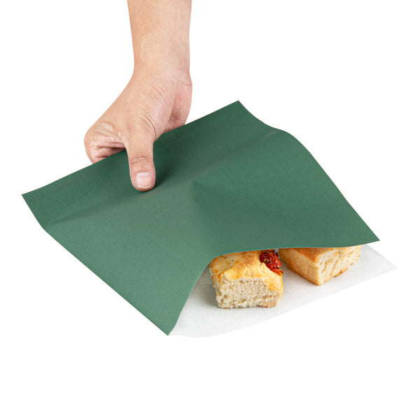 Parcel your snacks in the Bag Tek Forest Green Paper Large Double Open Bags. These deli paper sheets are created from durable paper and feature a double-open design that work incredibly well for grab-and-go treats or as cone basket linings. With a calming forest green finish, these deli wrap liners upgrade the look of foodservice by making it aesthetically appealing. These paper snack wraps have a greaseproof PE lining to safeguard against oily residue, making them perfect for a variety of food. To easily reheat snacks, these sandwich wrappers can be microwaved for up to 2 minutes for warm takeaway eats. These microwave-safe liners are recyclable to provide for an environmentally friendly disposal after eating. Each double open bag measures 10 inches in length by 9 inches in width. Sold in a 100 count box.
