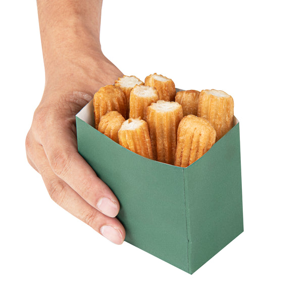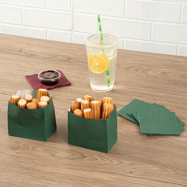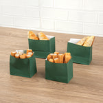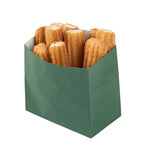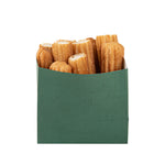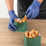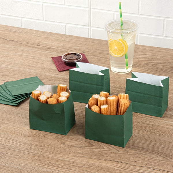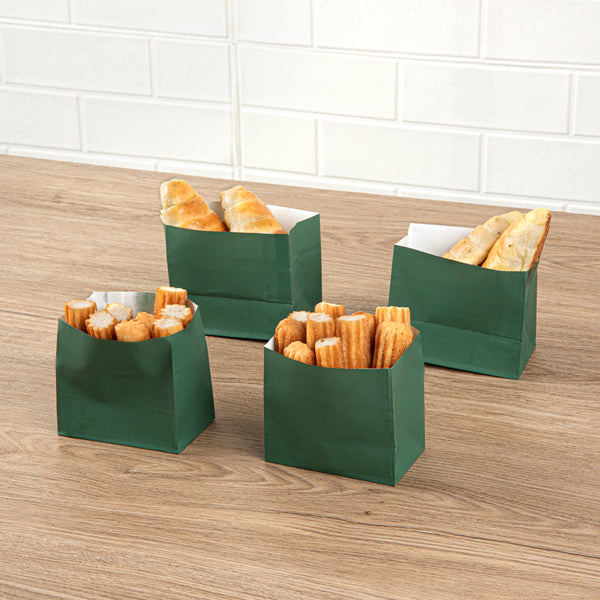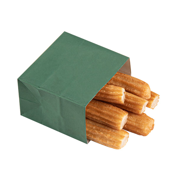 Maintain snack freshness with versatile green paper snack bags. These bags are designed to ensure mess-free serving of pastries and other treats. Their food bags construction supports both cold and hot food items, making them an ideal choice for diverse menu offerings while ensuring a sleek, modern presentation. The flat-bottom design further enhances their utility by allowing them to stand upright, facilitating easy packaging and display. Elevate your foodservice operation with these efficient and stylish snack bags. Each order includes 100 Bag Tek Green Paper Snack Bags.