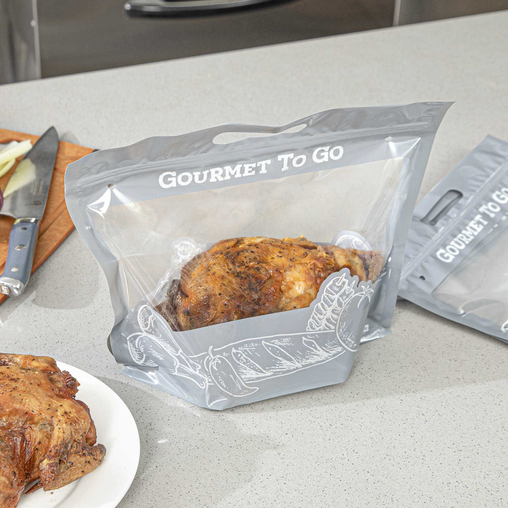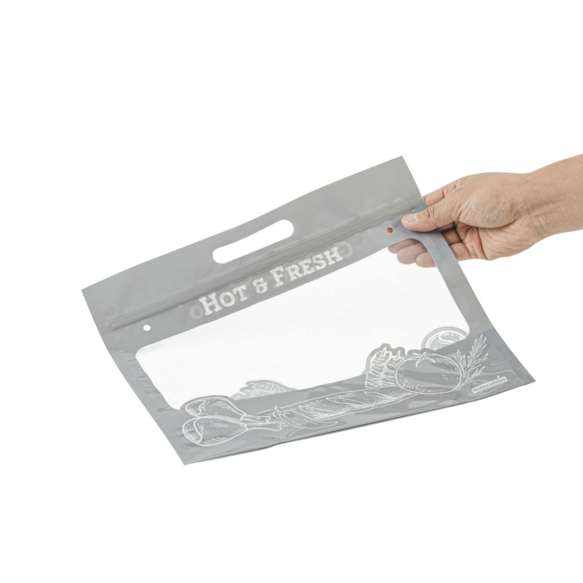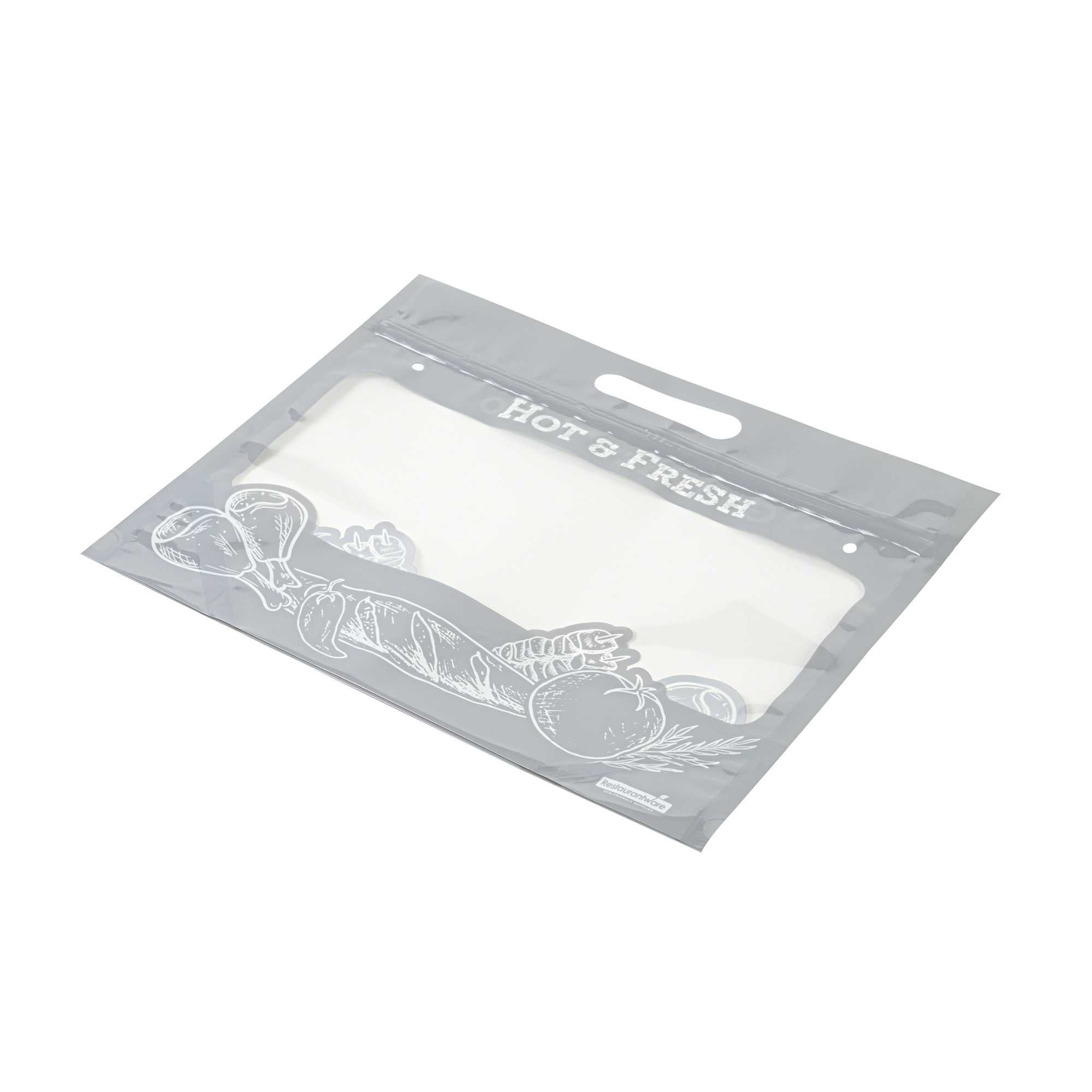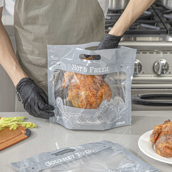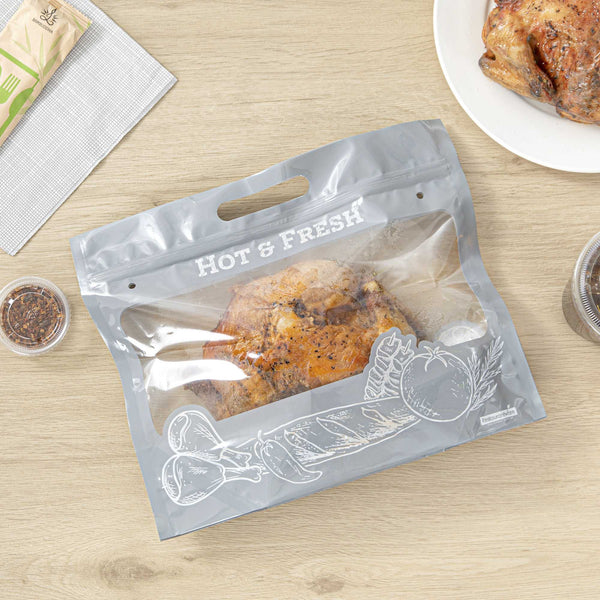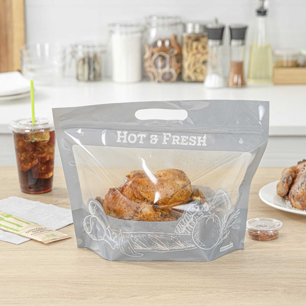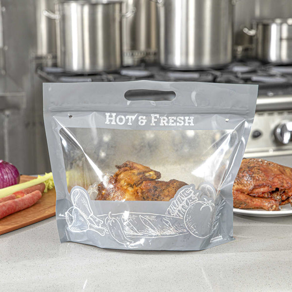 Gently store your just-cooked rotisserie chicken in our Bag Tek Gray Plastic Rotisserie Chicken / Hot Food Bags. Ideal for delis, buffet-style restaurants, or casual dining, these bags guarantee heat retention, ensuring meals remain steaming hot during transportation. Featuring a transparent window at the front, these hot food bags expedite meal identification. These hot delivery bags also have small vent holes for steam evacuation. Perfect for carrying rotisserie chicken or grilled turkey, these food transport bags are equipped with sturdy handles. With a convenient zipper design, these food delivery bags ensure quick opening, easy resealing, and continued freshness of your hot food. Manufactured from high-grade plastic, these rotisserie chicken bags are built to be greaseproof and leakproof, minimizing messiness. These food storage bags showcase a chic gray tint that amplifies the appeal of your meal presentation. Suitable for microwave use, these plastic bags simplify food reheating. Measuring 12.75 inches in length by 5.75 inches in width by 10.25 inches in height, these carry bags can generously contain large servings of chicken wings, ribs, grilled turkey, and more. Shipped in a 100 count box.