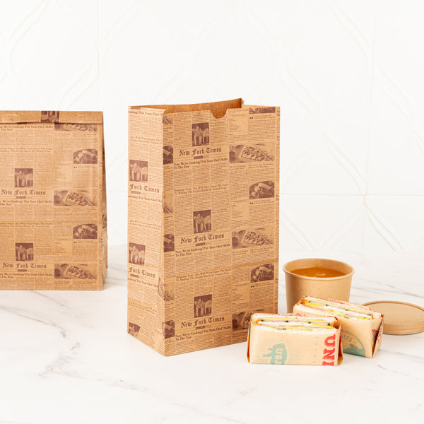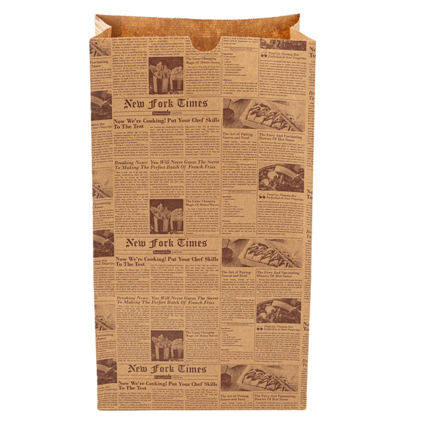 Conveniently pack your guests' meals by using our Bag Tek Kraft Newsprint Paper Bags. The premium build of these paper bags for food makes them durable to hold hefty food items without ripping. The newsprint design of these kraft bags gives a classic appeal to your food items. Conveniently retaining oils and sauces, these paper sandwich bags provide your customers with a smooth take out experience. The open-top design of these brown paper bags allows you to pack long food items, like tall bread. Made from kraft material, these newsprint paper bags are conveniently microwavable and freezable for your convenience. These brown paper bags are sustainable and can be conveniently disposed of after use to speed up your cleanup process. With a rectangular flat bottom, these paper bags without handles can be placed upright without tripping. The gusset sleeves on the sides of these kraft paper bags allow you to extend them, providing more space to pack your food. Measuring 7 inches in length by 4.25 in width by 12.5 Inches in height, these grocery paper bags can hold up to 12 pounds. Sold in a 100 count box.