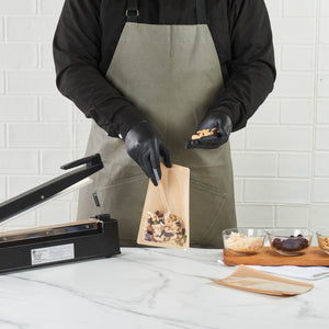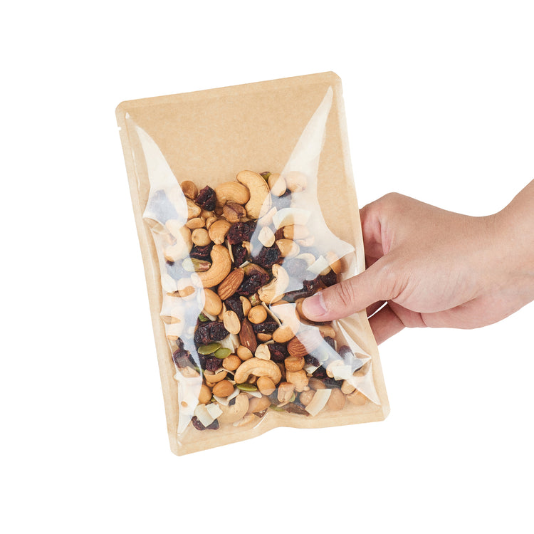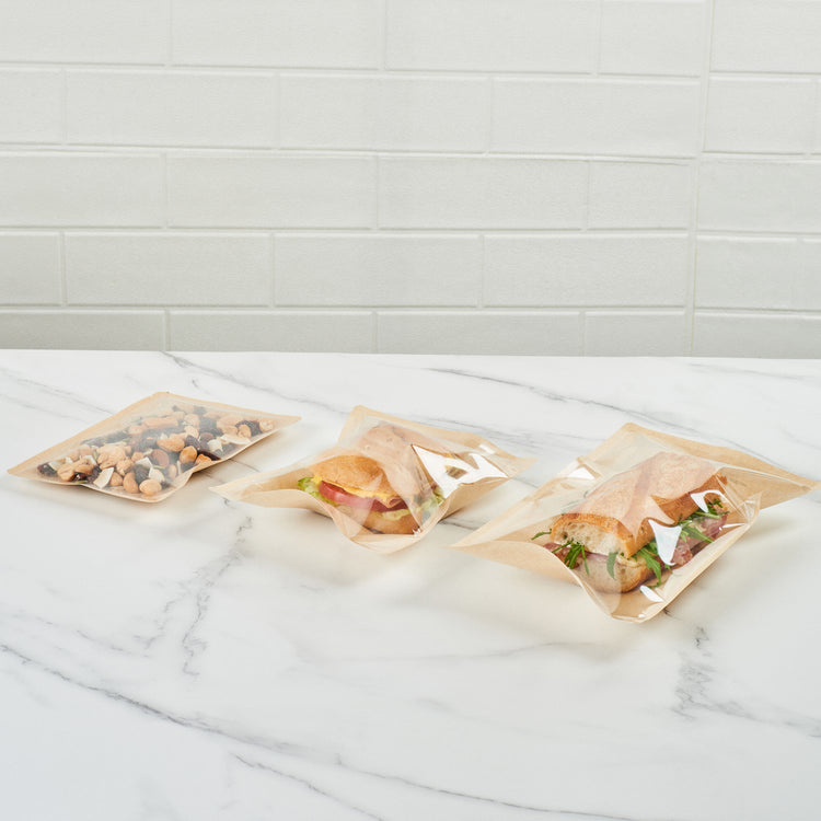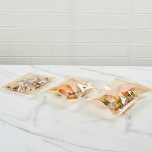 Keep your foods fresh with our Bag Tek Kraft Plastic Small Sandwich and Snack Bags. Convenient to use, these food storage bags are heat-sealable, making them airtight to lock in the freshness of the foods, keeping them crisp and odorless for a long time. These sandwich bags feature a greaseproof coating that stops the leaking of oil through the package, saving the customers' clothes from messy stains. The kraft finish gives these food packaging bags a clean look, and the clear window helps display the content of the bag while keeping them untouched and untempered. Great for packing small servings of treats, these kraft plastic bags for cookies can be used while traveling or camping. These bakery pouches for candies are disposable for easy cleaning. With their elegant kraft finish, these heat-seal bags blend in with any table decor. Convenient to use and dispose of, these heat seal bags make the cleaning process easy. Each snack bag measures 8.25 inches in length by 5.25 inches in width. Sold in a 100 count box.
