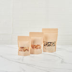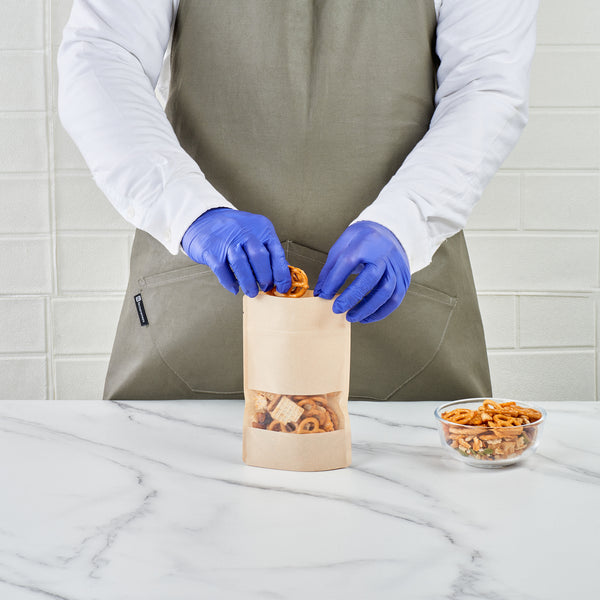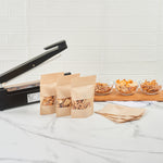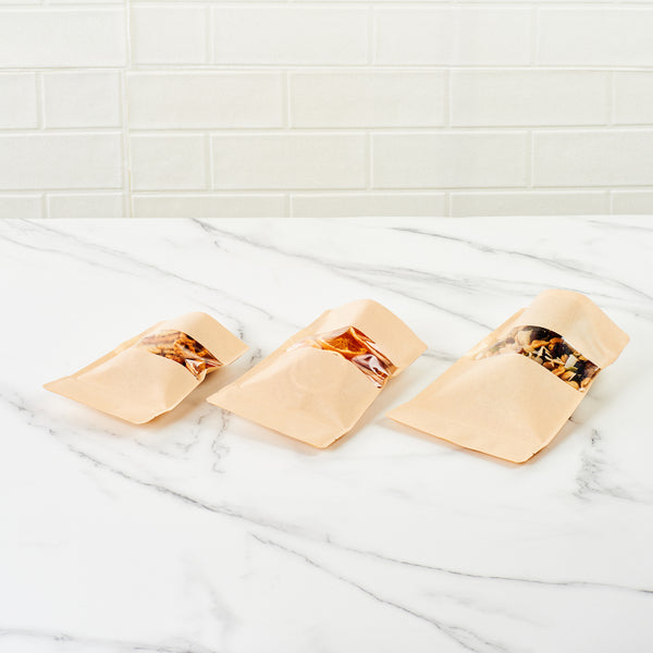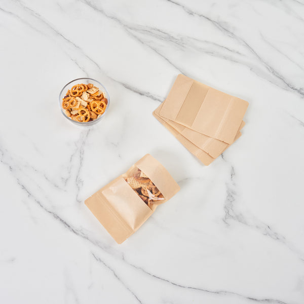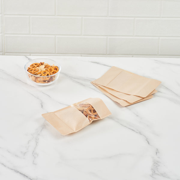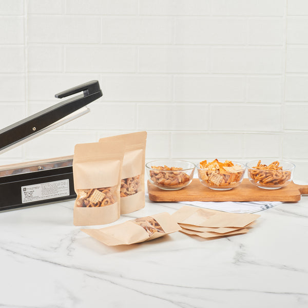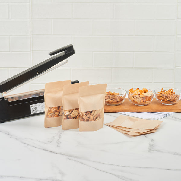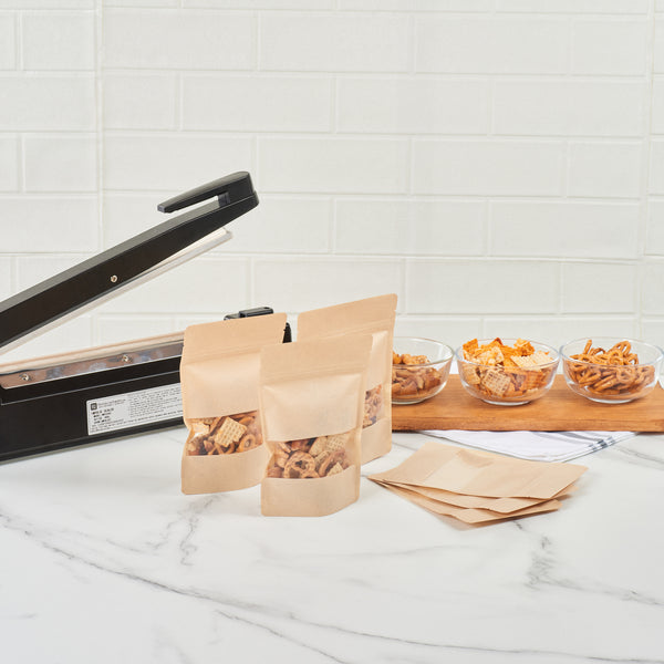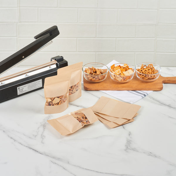 Add style to treat presentations with our Bag Tek Rectangle Kraft Plastic Small Window Bags. These dessert bags are heat sealable to lock in the freshness of foods for longer and help create a tamper-evident packaging solution. With a clear plastic window, these food bags expertly showcase your grab-and-go items to make them the center of attention at your foodservice establishment. These heat sealable bags feature tear notches that allow customers to open bags with ease. Made from high-quality kraft paper, these durable candy bags are conveniently recyclable to meet the eco-friendly standards at your catering service, restaurant, or bakery. Seal these kraft bags with our impulse sealers (SKU: RWT0243 or RWT0244) to preserve the taste of snacks. Measuring 7 inches long by 4.75 inches wide by 1.5 inches tall, these kraft treat bags are sold in a 100 count box. Impulse sealers are available and sold separately.
