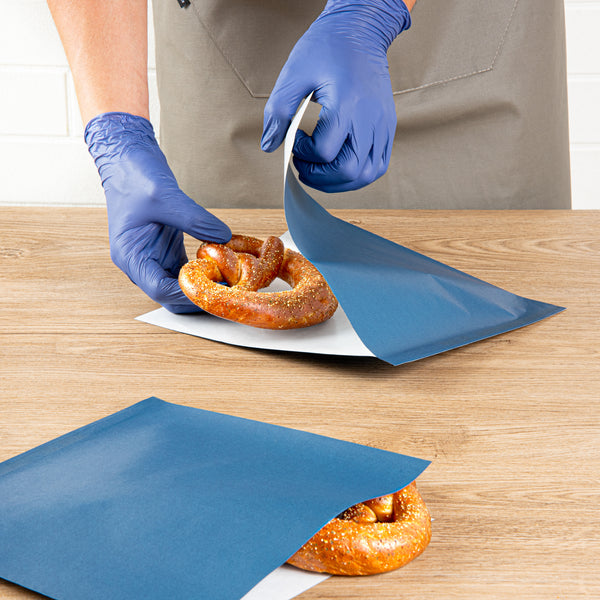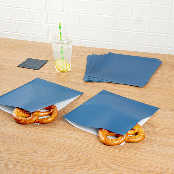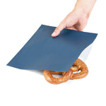 Offer your delights in Bag Tek Midnight Blue Paper Large Double Open Bags. These sandwich wrappers are crafted from premium paper and designed with a dual-opening structure that can double as cone basket linings or packing for on the go snacks. The sophisticated midnight blue finish of these deli paper liners adds an elegant touch to elevate the visual presentation of food displays. Engineered with a greaseproof PE lining, these microwave-safe bags effectively prevent oils from penetrating and causing any untidiness. When it comes to reheating meals, these paper snack wraps can be safely placed in the microwave for up to 2 minutes. These deli paper sheets are also eco-friendly and recyclable, to provide an eco-friendly way to dispose of them after eating. Each double-open bag measures 10 inches in length by 9 inches in width. Available in a 100 count box