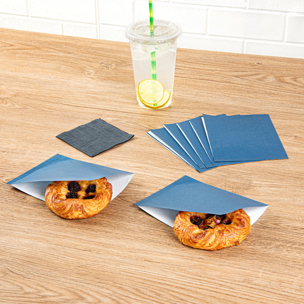 Experience the convenience of snacking with our Bag Tek Midnight Blue Paper Small Double Open Bags. These sandwich wrappers are created from premium paper and can serve as liners for cone baskets or wrapping up snacks for on-the-go. Featuring a greaseproof PE lining, these paper snack wraps effectively repel oily stains, ensuring their visual appeal remains immaculate and pristine. These deli paper sheets are microwave-safe and can be used to quickly heat your food for up to two minutes for a delightful and warm snacking experience. The midnight blue finish of these deli wrap liners instantly enhances the visual image of meals, making them appetizing and appealing. These midnight blue bags epitomize sustainability and are recyclable, playing a role in reducing the carbon footprint of your food establishment. Each double-open bag measures 6.25 inches in length by 4.75 inches in width. Sold in a 100 count box.