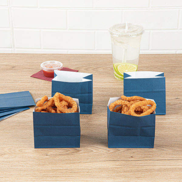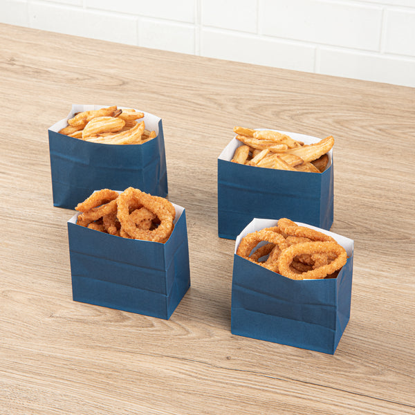 Avoid messes with our bags that maintain freshness. Bag Tek 4 Oz Paper Snack Bags are designed with a lining to keep baked goods looking pristine, making them ideal paper snack bags for bakeries and cafes. Crafted from durable paper, these bags are cold food friendly, perfect for chilled desserts or snacks, and their recyclable nature supports eco-conscious business practices. The midnight blue color adds elegance, enhancing product presentation to captivate customers. With compact dimensions of 3.75 inches by 2.25 inches by 3.75 inches, these versatile bags are excellent for portion control, helping manage costs and maintain consistency in serving sizes. Each order includes 100 Bags.